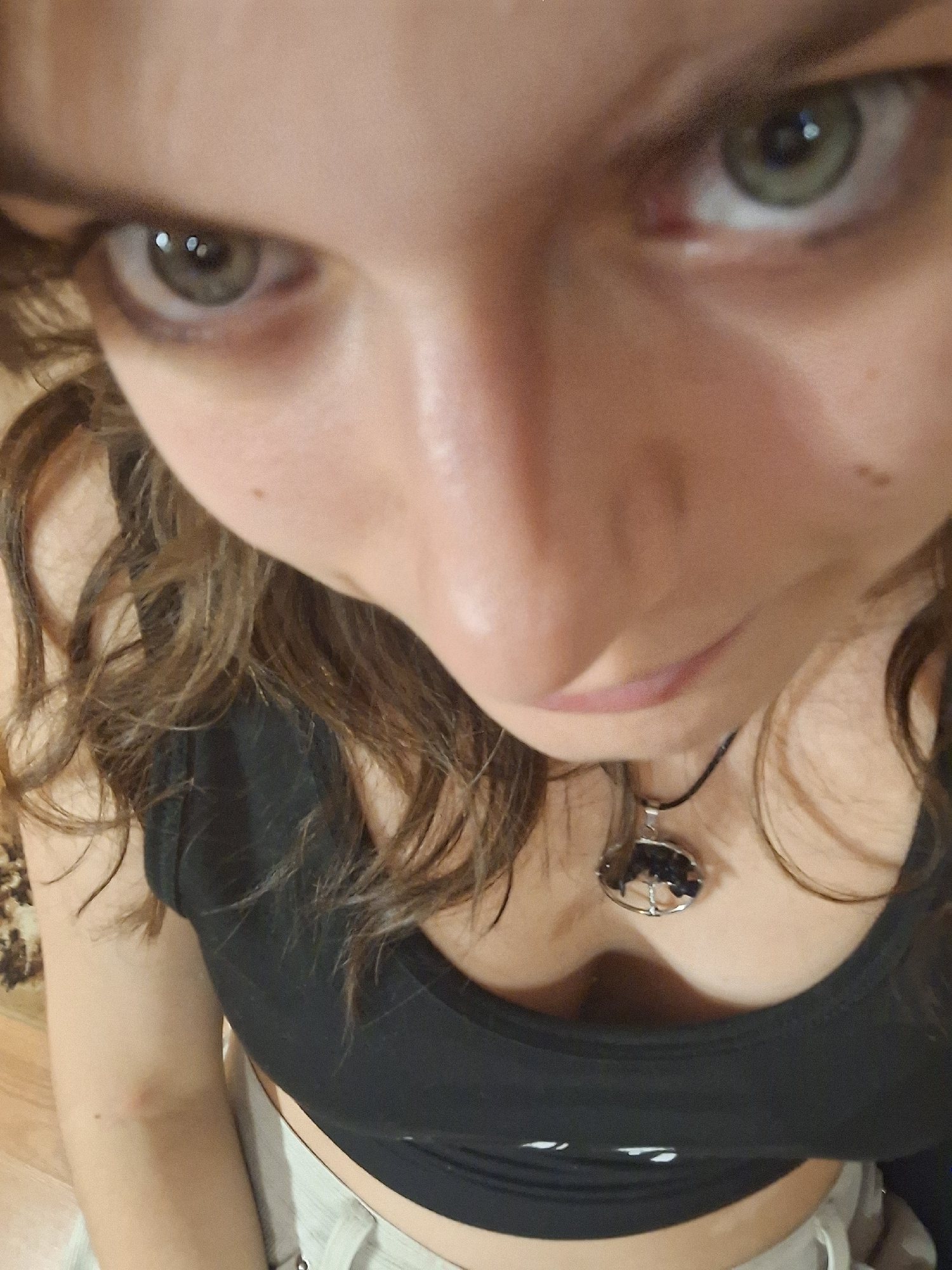 A close-up, angled selfie shows a woman with green eyes, brown, curly hair, and fair skin. She wears a black top and a necklace with a silver pendant. The background is blurry and indistinct, suggesti…read more