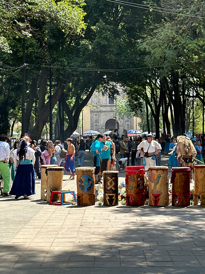 The image depicts an outdoor cultural gathering in the Historic Center of Mexico City, Mexico, likely in a public plaza or park near **Francisco I. Madero Avenue**, with the **Palacio de Cultura Citib…read more