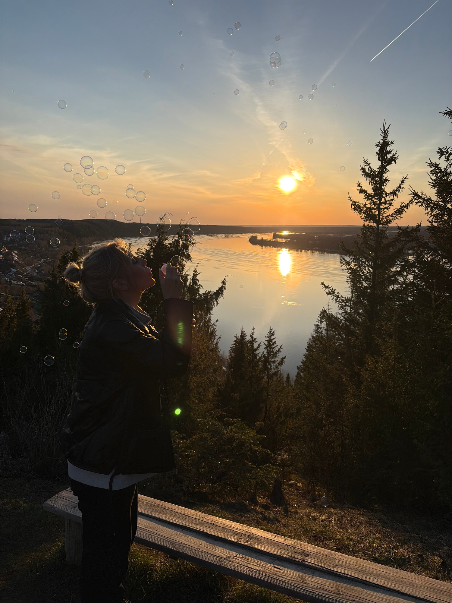 A woman is blowing bubbles while sitting on a wooden bench at dusk, with a body of water and the setting sun in the background. The scene is at least partially set in Ольховка, Russia. The sky transit…read more