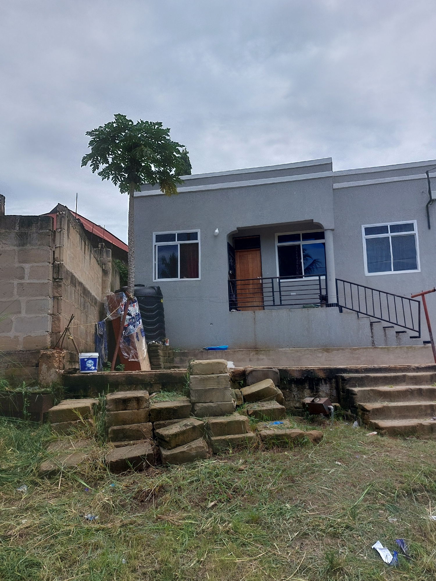 A two-story gray building with white-framed windows and a small balcony is the focal point of the scene. A stairway with a black railing leads to the second floor. The building is situated next to a g…read more