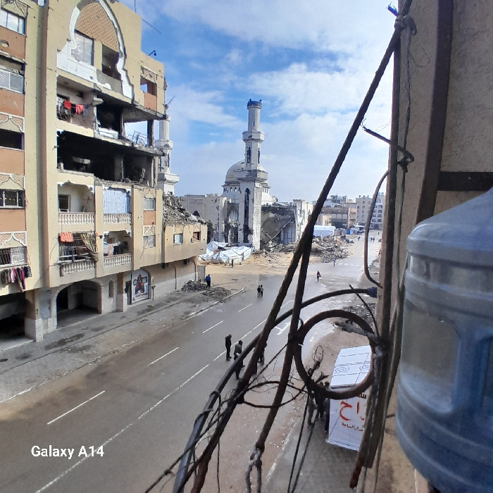 The image presents a severely damaged urban landscape in Khan Yunis, Palestinian Territory, viewed from an elevated perspective, likely a balcony. In the background, a large mosque is heavily damaged,…read more