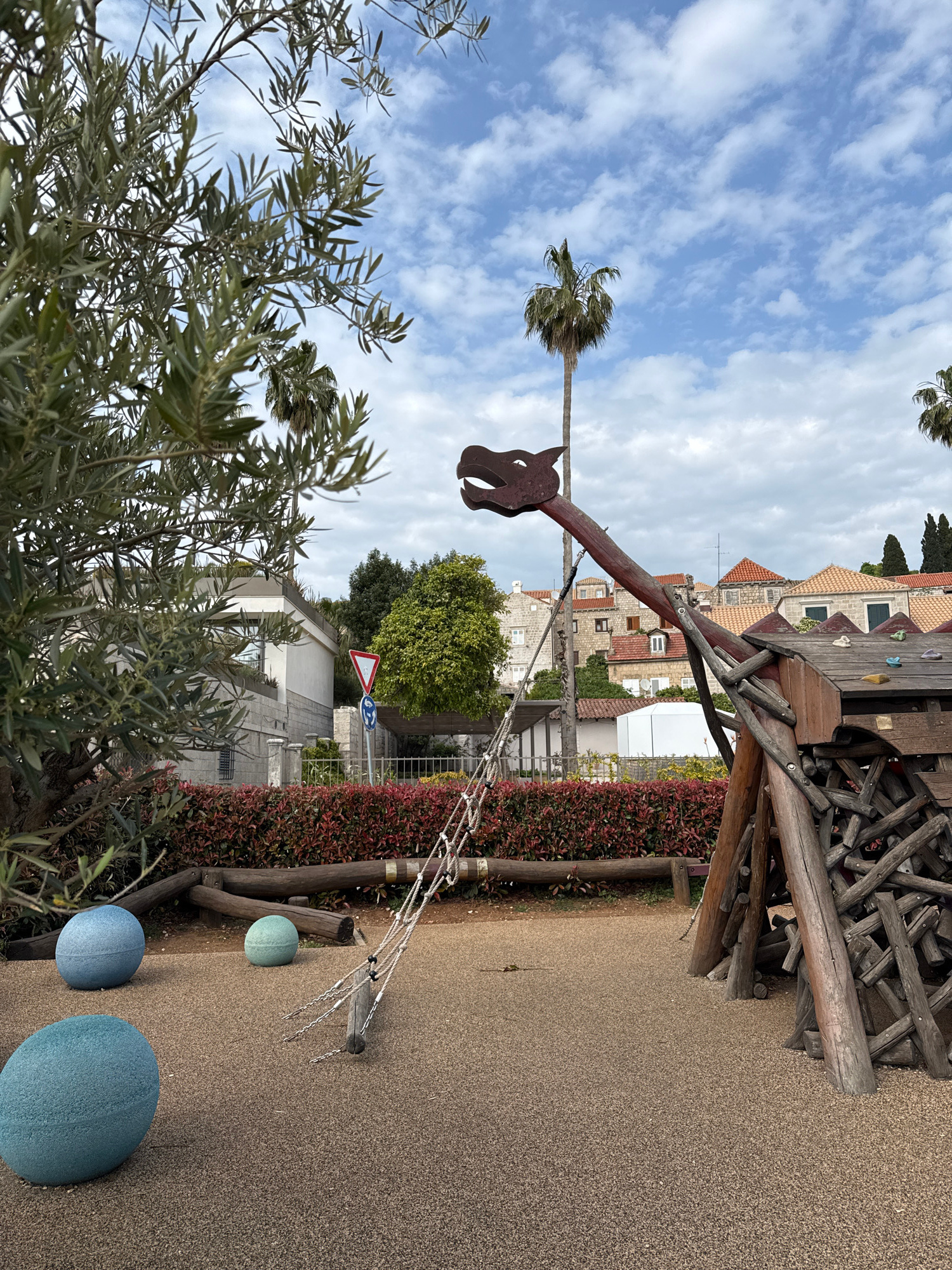 This daytime image captures a picturesque scene in Cavtat, Croatia, focusing on a rustic playground area with traditional architecture in the background. The photo appears to be taken from a slightly…read more