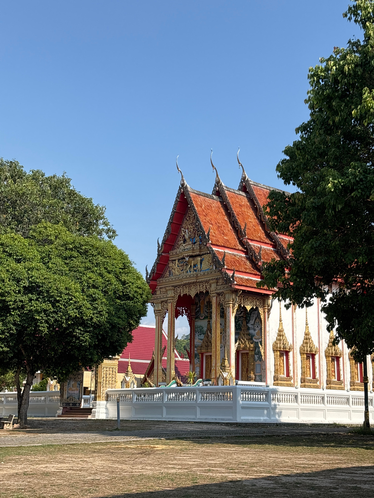 An outdoor, eye-level shot captures a magnificent Thai temple, likely a Wat, set against a clear, vibrant blue sky in Choeng Thale, Thailand. The temple building, oriented horizontally across the fram…read more