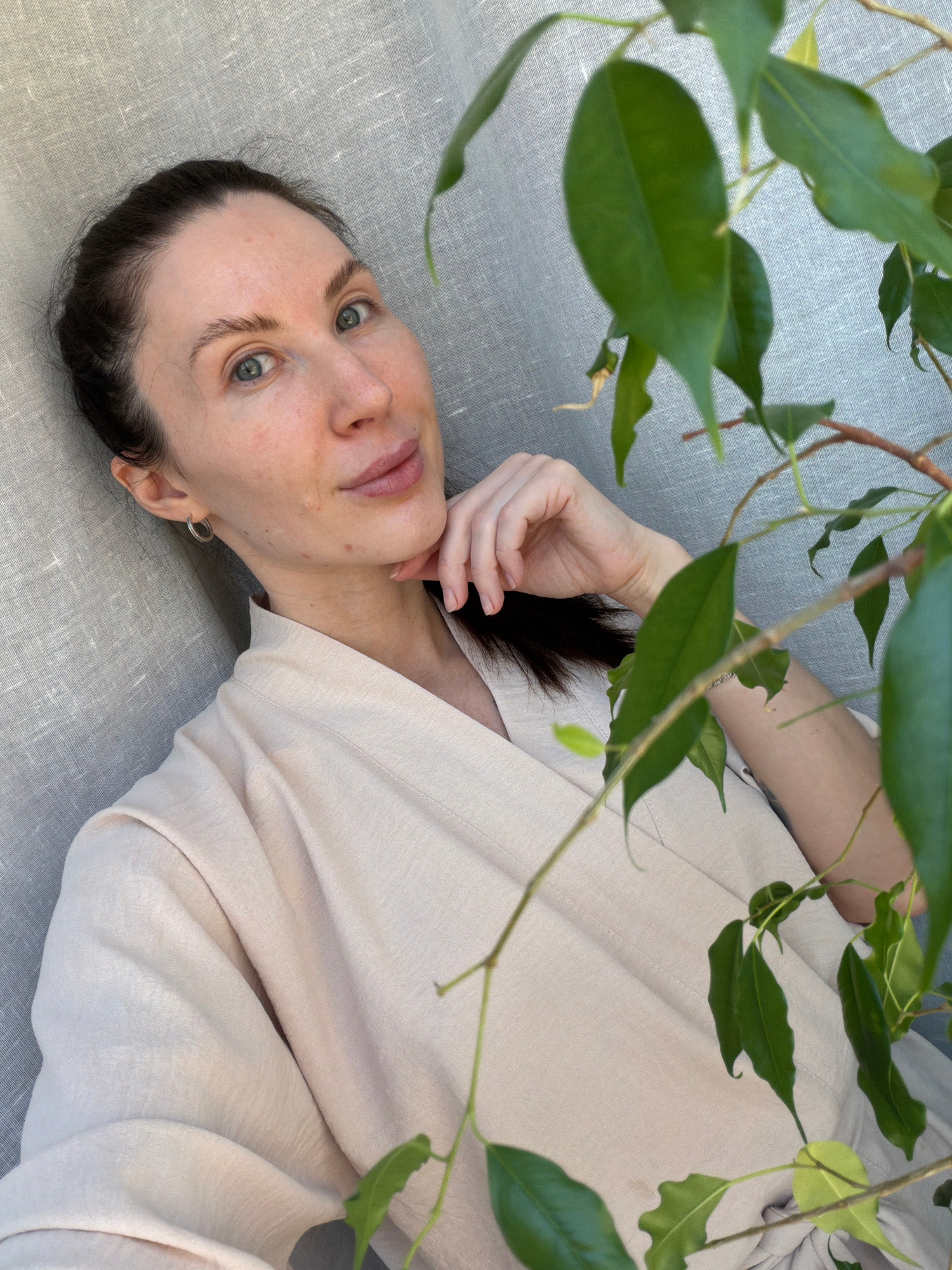 A woman with fair skin and dark hair is lying down, her head resting on a textured gray surface, likely fabric. She is wearing a light beige garment. Her hand is positioned near her neck. Green leaves…read more