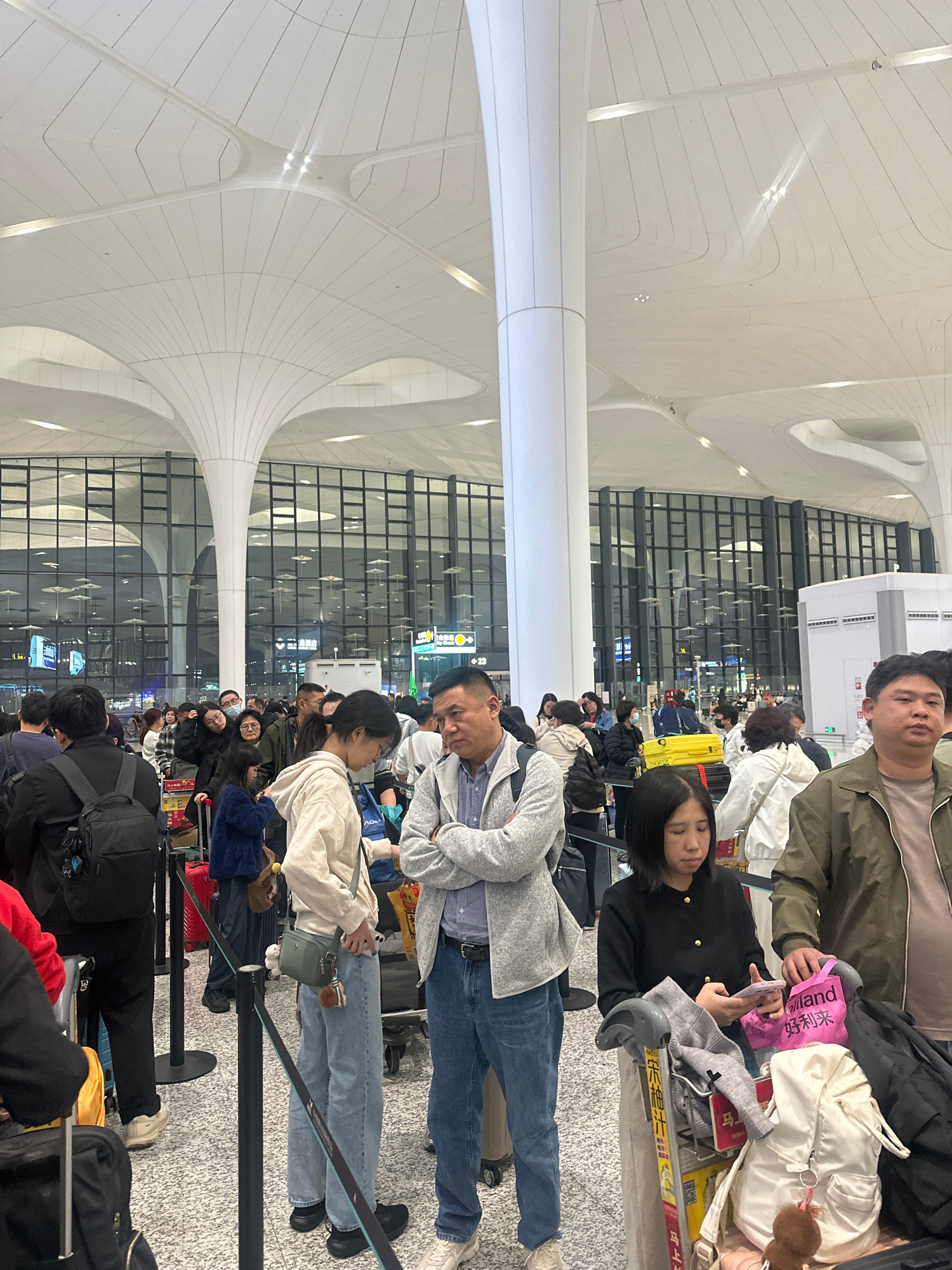 The image depicts the interior of a bustling, modern airport terminal located in Xiaoshan District, China. A large crowd of individuals, primarily of East Asian ethnicity, fills the space, appearing t…read more