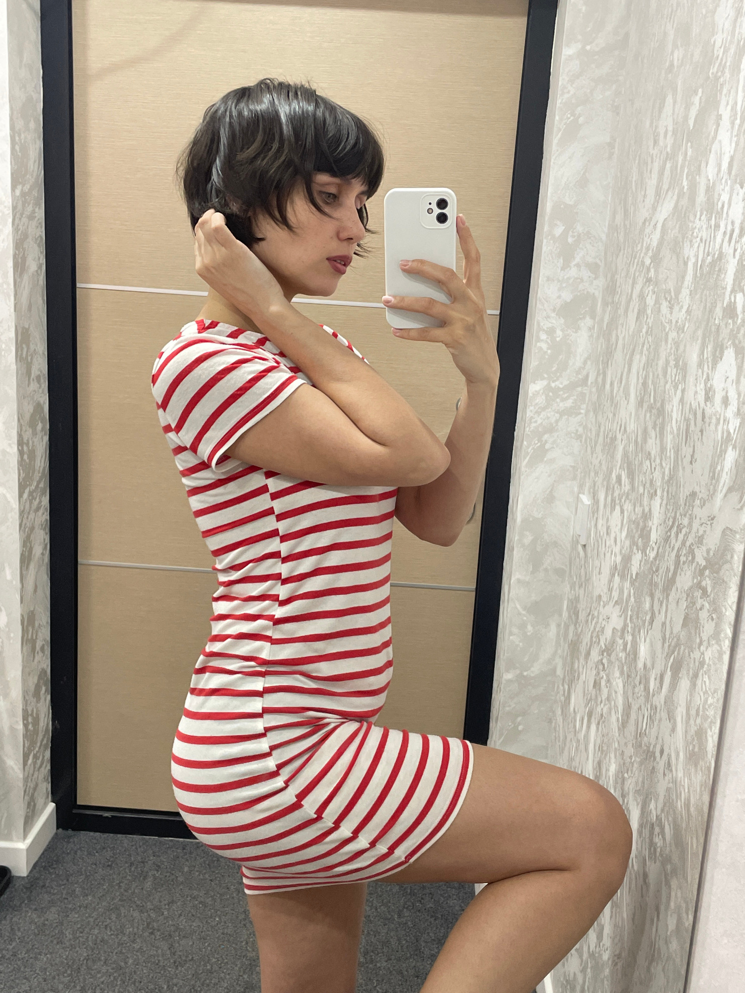 A woman is taking a selfie in a room. She is lying on her side, wearing a red and white striped dress. The walls are cream-colored with black trim. The floor is gray. A marble-patterned surface is vis…read more