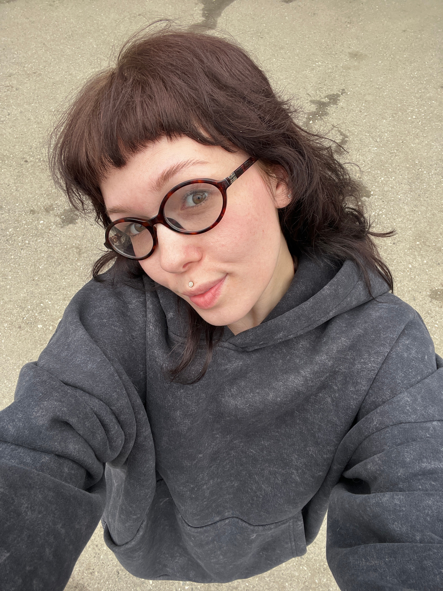 A woman with dark brown, shoulder-length hair, bangs, and wearing round, tortoiseshell-patterned glasses is the primary subject of the image. She has fair skin and a lip piercing. She is wearing a gra…read more