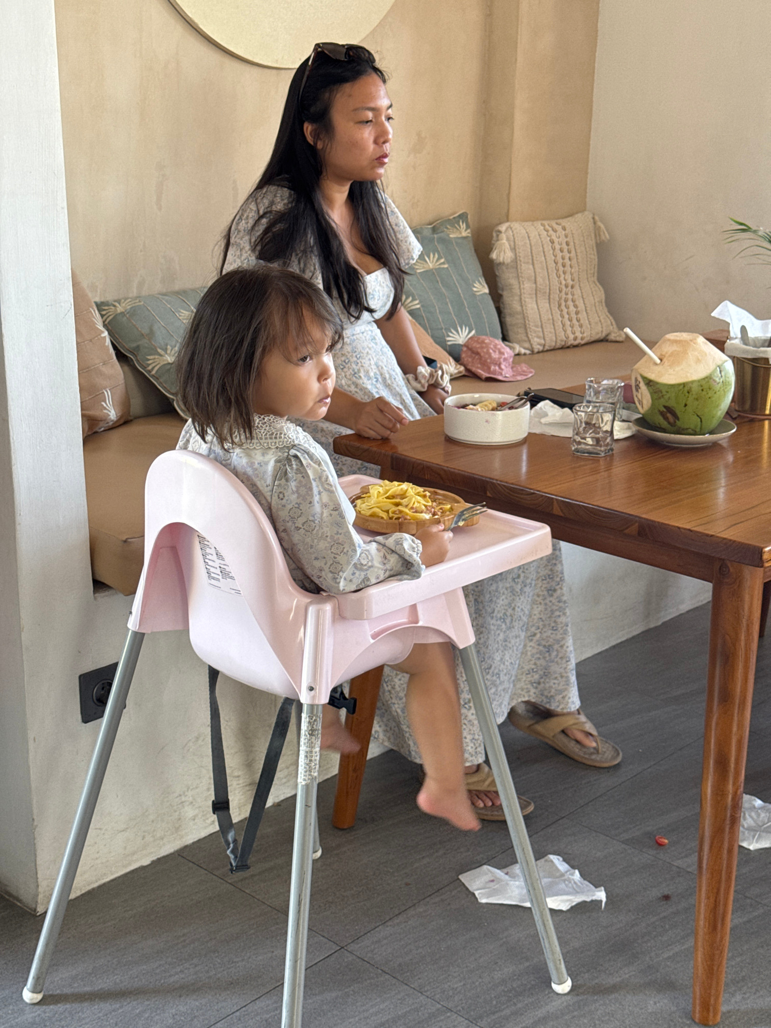 Captured from an elevated viewpoint in Kuta Selatan, Indonesia, the image features a woman with long, dark hair and sunglasses resting on her head. She wears a floral dress and sits near a wooden tabl…read more