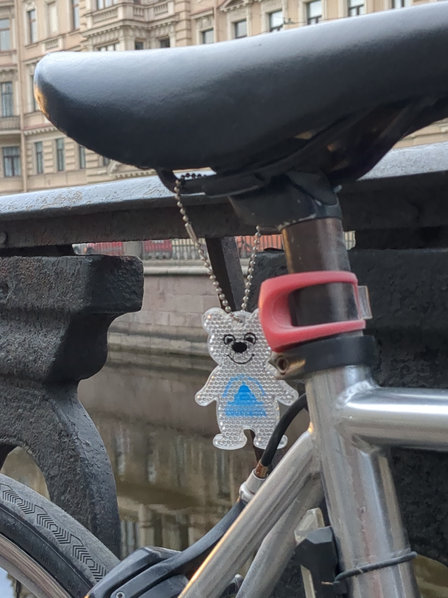 A close-up photograph depicts a bicycle parked outdoors in Saint Petersburg, Russia. The image focuses on the bike seat, frame, and rear tire, with a building visible in the blurred background. A refl…read more