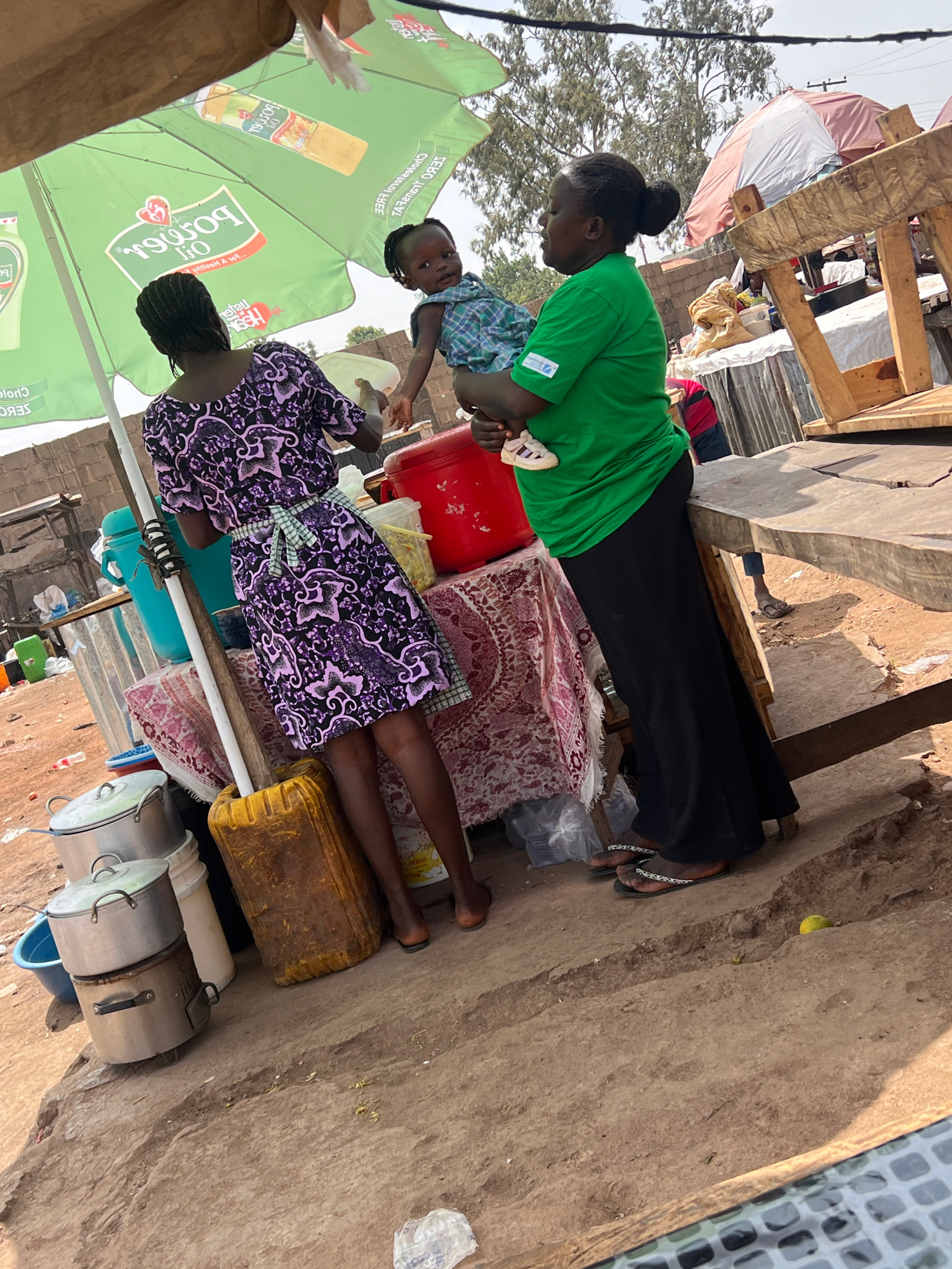 A woman in a green shirt and black pants stands next to a red container, holding a child wearing a blue plaid shirt. Nearby, another woman wearing a black and purple patterned dress stands next to an…read more