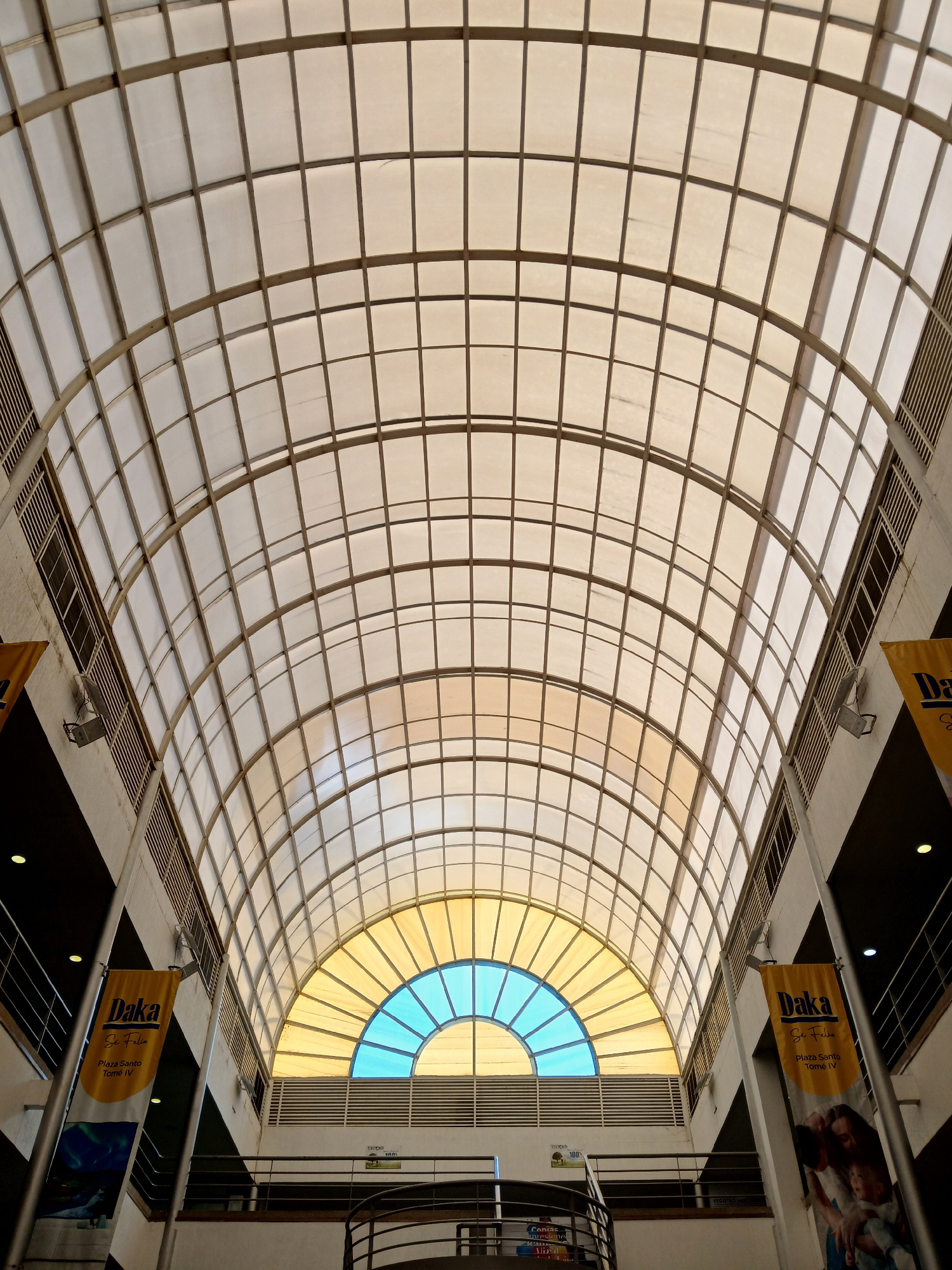 Here's a detailed description of the image: **Setting:** The image is taken from below, looking upwards into a large, curved skylight. The skylight is constructed with a grid of metal supports, form…read more