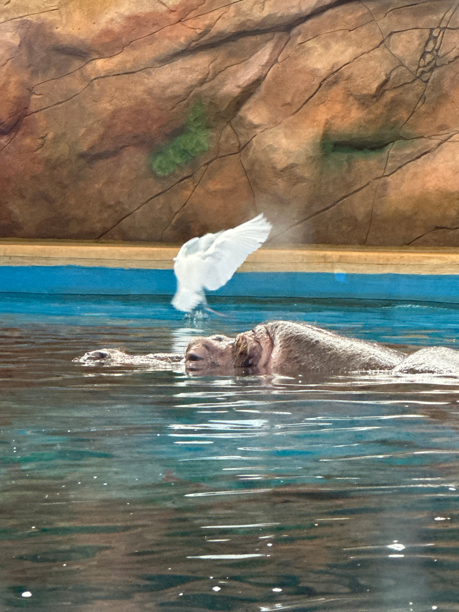 A hippopotamus is partially submerged in a pool of water in front of a painted backdrop with a wall that resembles rocks and a splash of green. A white bird with outstretched wings appears to be flyin…read more