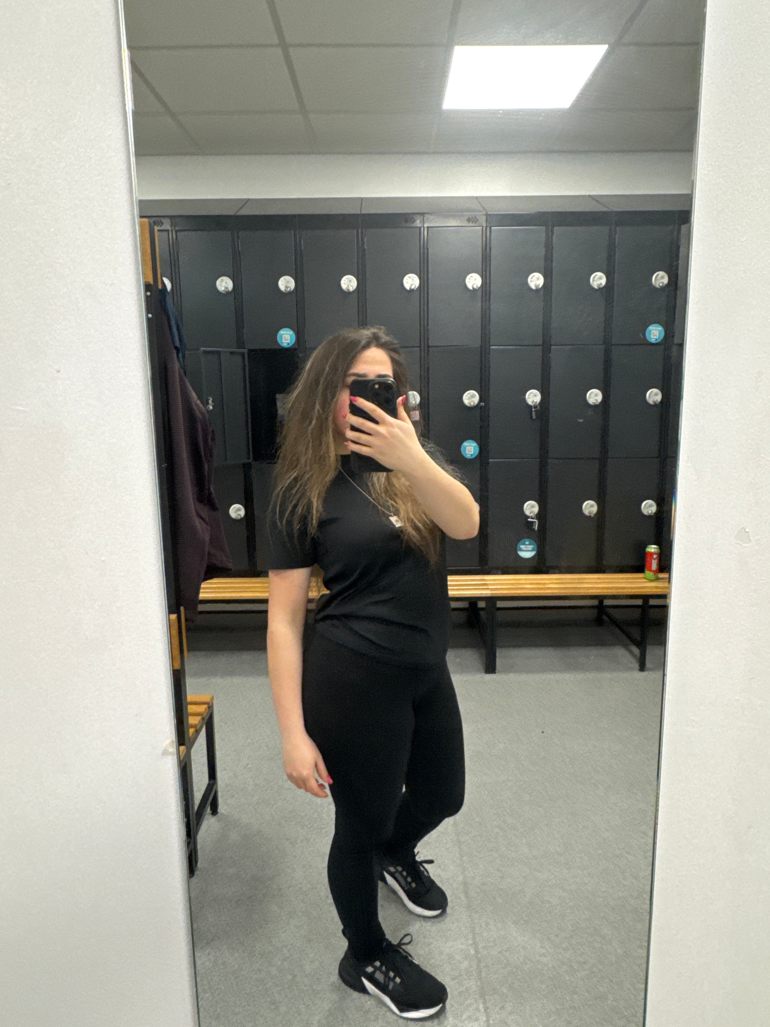 A woman is taking a mirror selfie. She wears black leggings and a black shirt with black trainers and stands in front of a locker room in the city of Chester, United Kingdom. The lockers are dark blue…read more