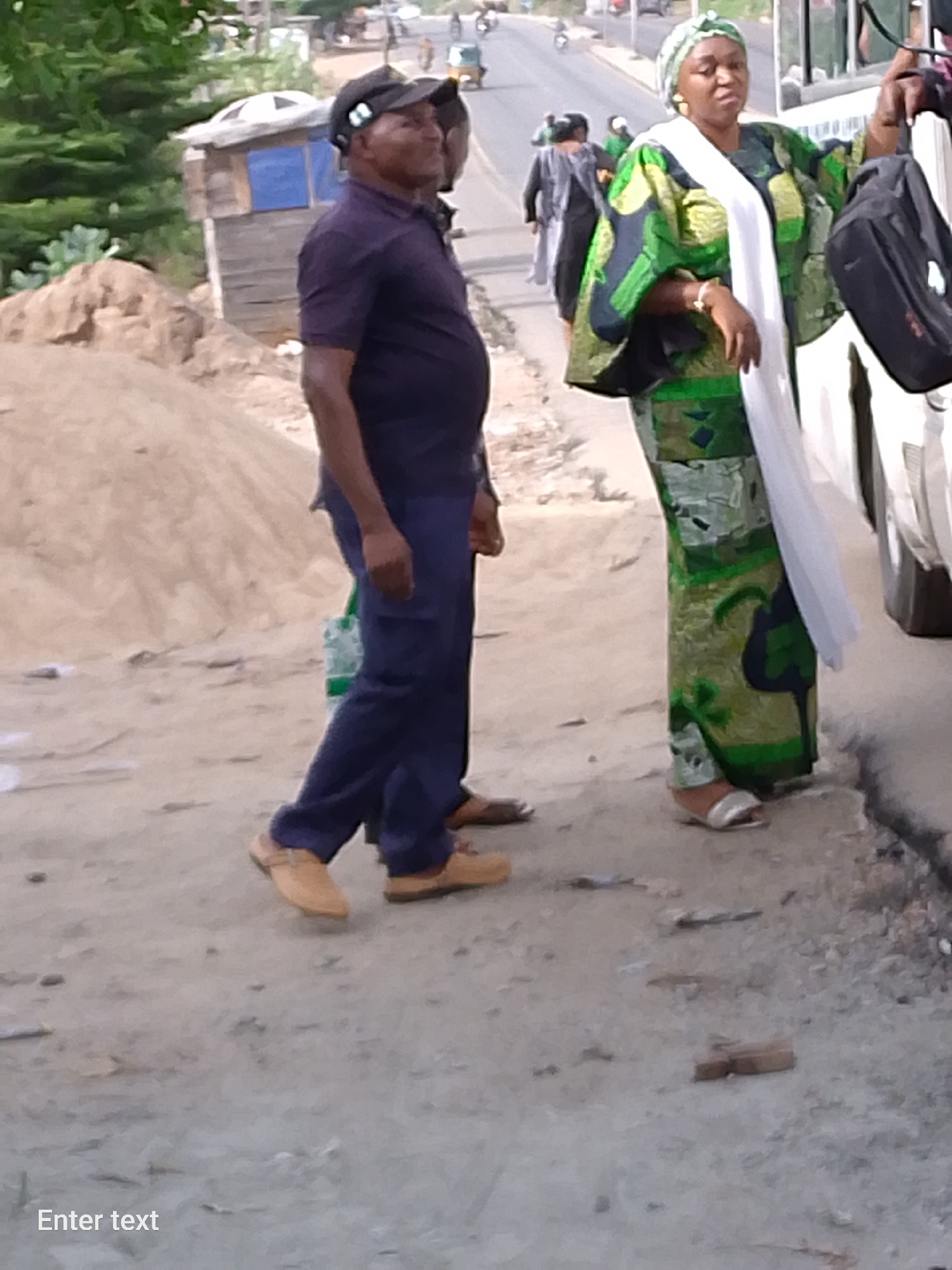 The image depicts a street scene in Adankolo, Nigeria. A man in a dark blue polo shirt, dark blue pants, a dark baseball cap, and tan-colored shoes is walking along a dusty street. Beside him stands aβ¦read more