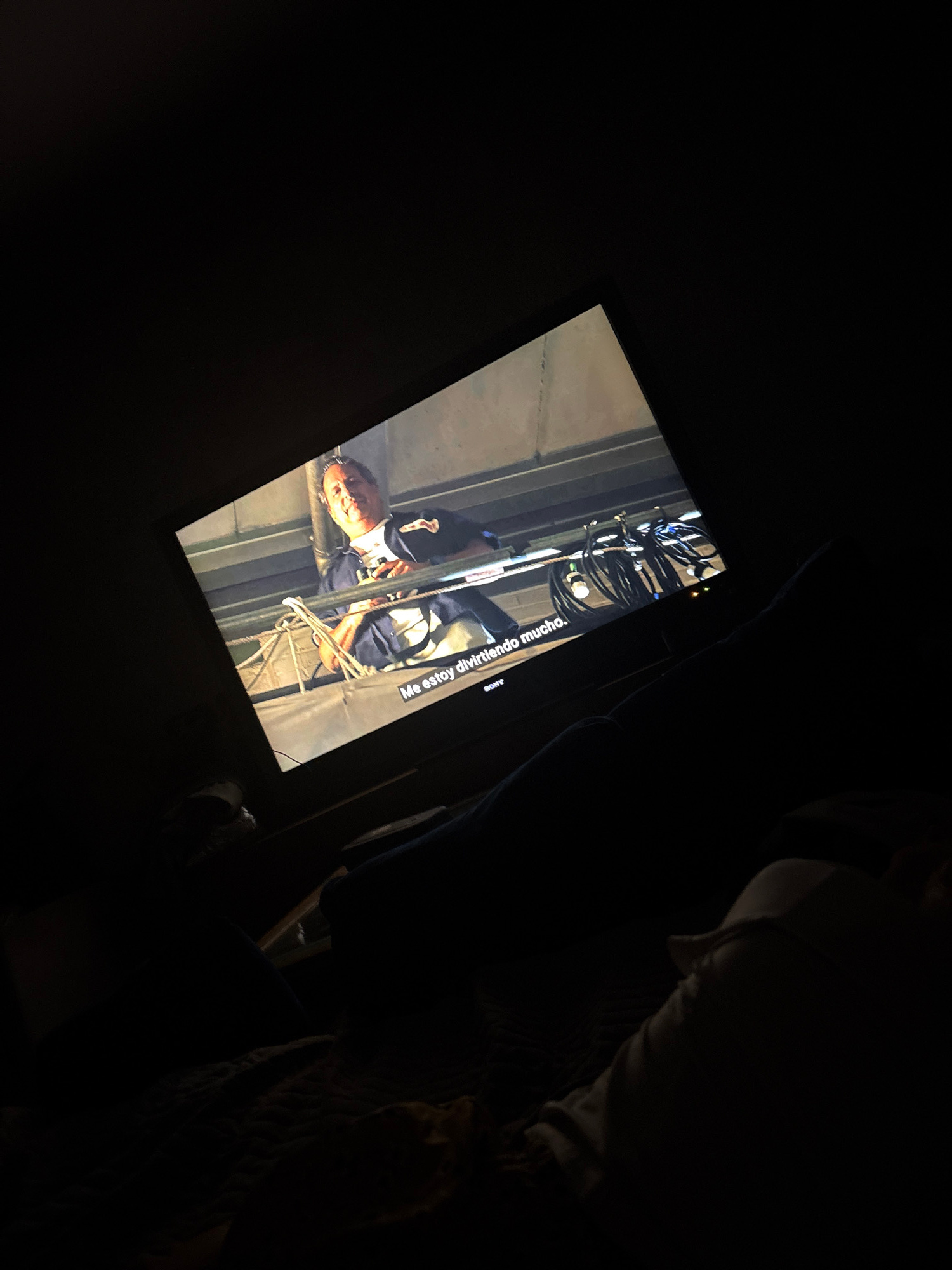 The photo shows a screen with a video of a man in Puebla, Mexico. The man is on a scaffolding or elevated structure. The screen is tilted and dimly lit, and a person's face is visible in the upper rig…read more