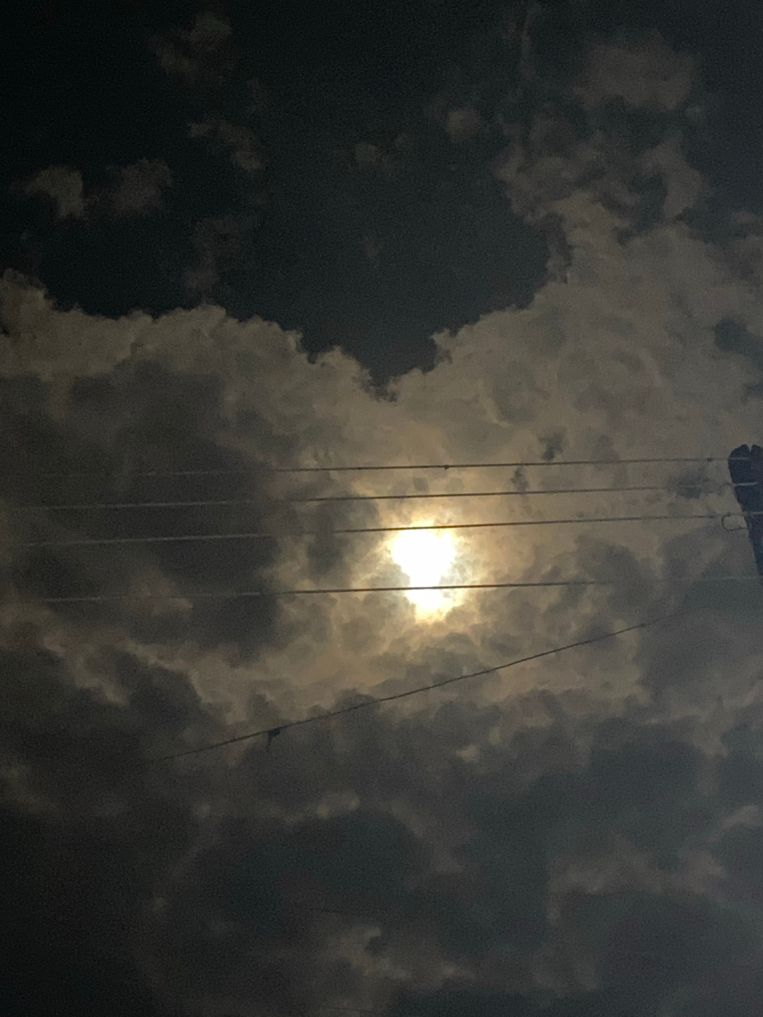 The image shows a night sky in Maigizo, Nigeria. The scene is dominated by dark, heavy clouds, partially obscuring a bright light source, likely the moon. Wires or ropes are visible stretching vertica…read more