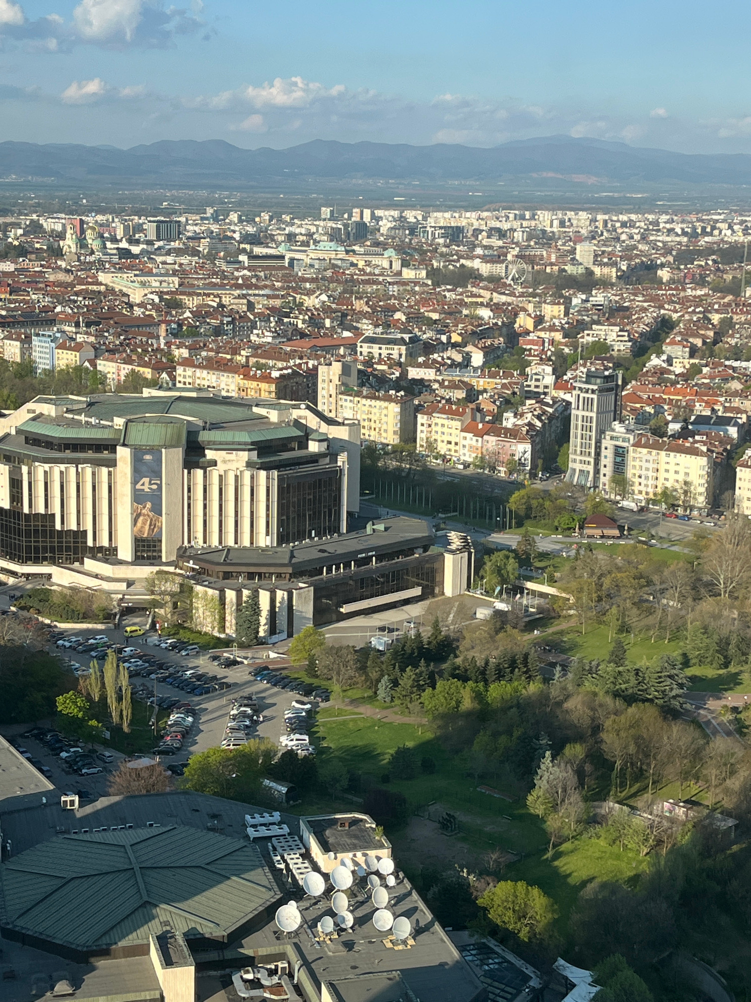 This is an aerial view of Sofia, Bulgaria, looking out over the city towards the mountains in the distance. The foreground is dominated by the rooftops of a modern building, featuring multiple satelliβ¦read more
