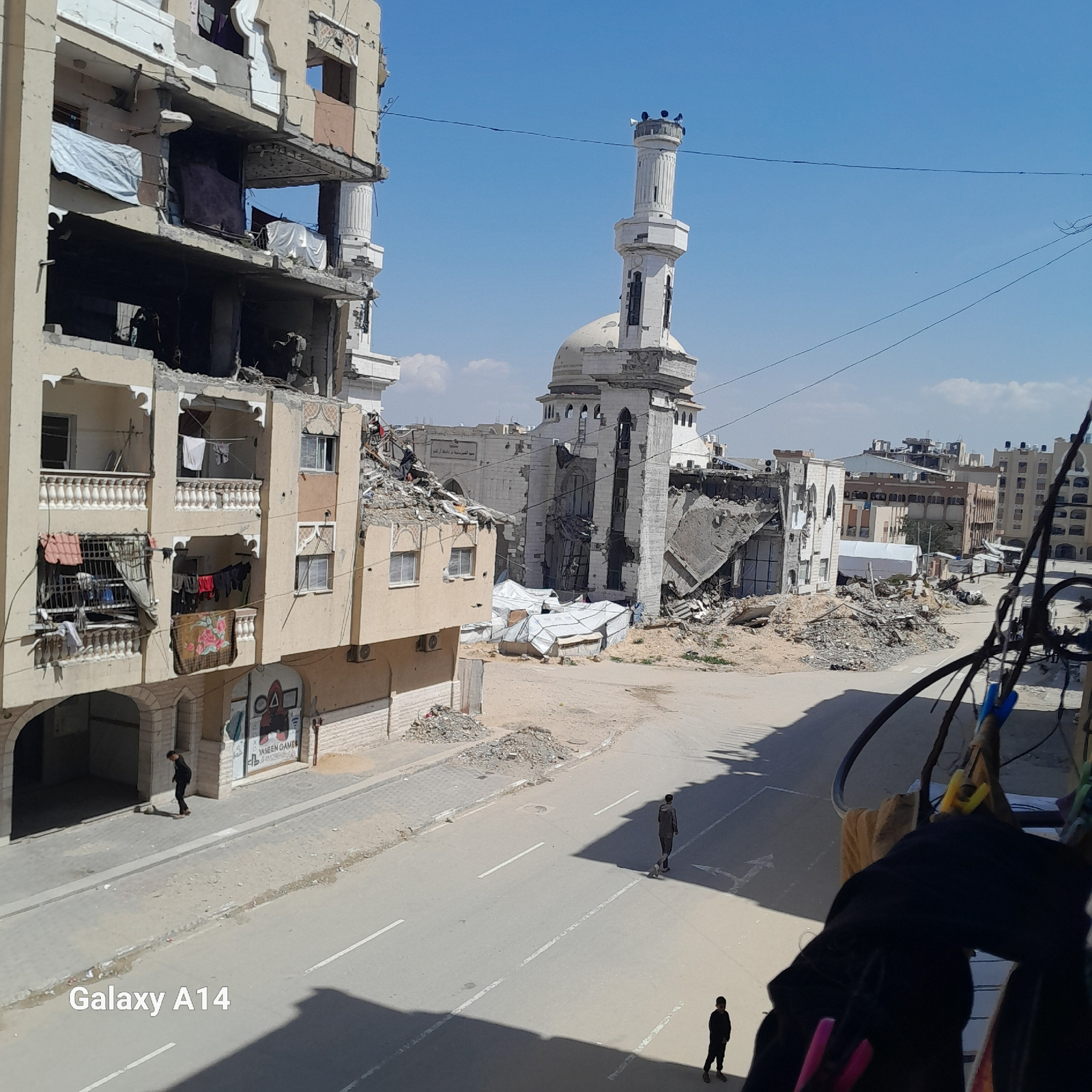 The image depicts a scene of destruction in Khan Yunis, Palestinian Territory. A partially collapsed building with exposed interiors stands adjacent to a damaged mosque with a prominent minaret. Debri…read more