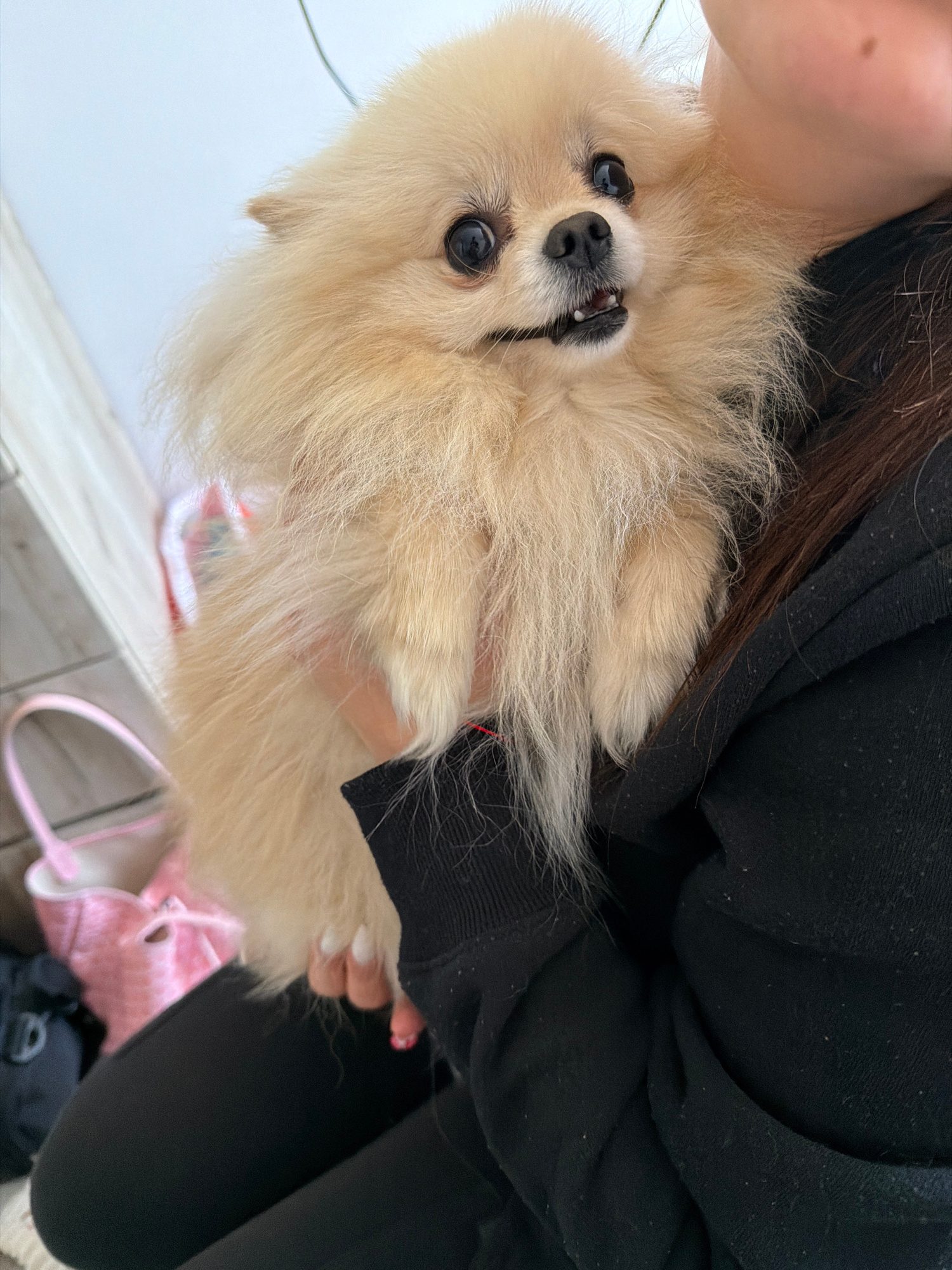 A light-colored Pomeranian dog is being held up close to the camera by a person. The dog has fluffy fur and a dark nose and eyes. The person holding the dog is wearing a black hooded sweatshirt and bl…read more