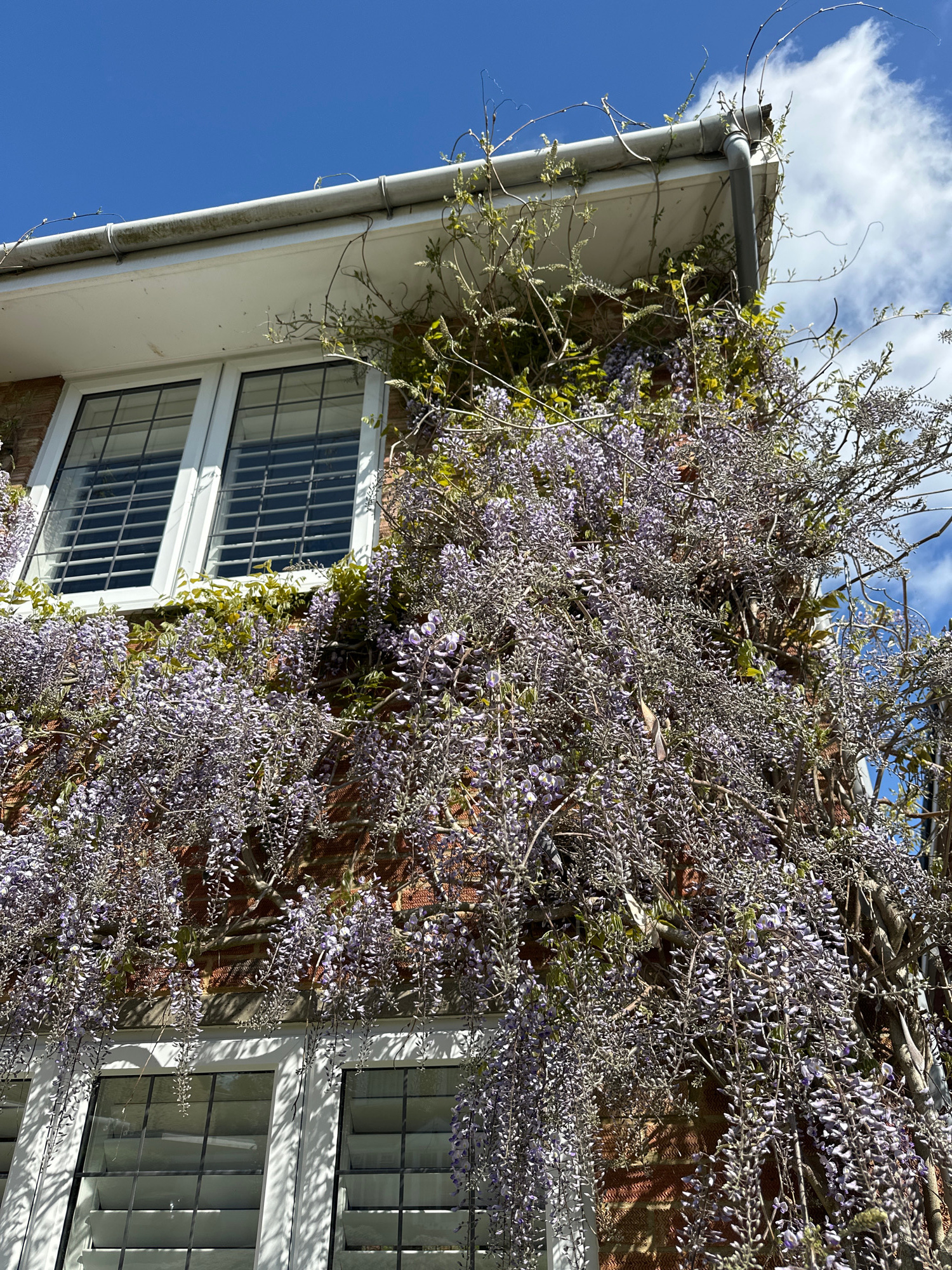 A low-angle shot captures a brick building in Tunbridge Wells, United Kingdom, partially covered by a profusion of lavender wisteria vines. The white-framed windows with multiple panes are visible on…read more