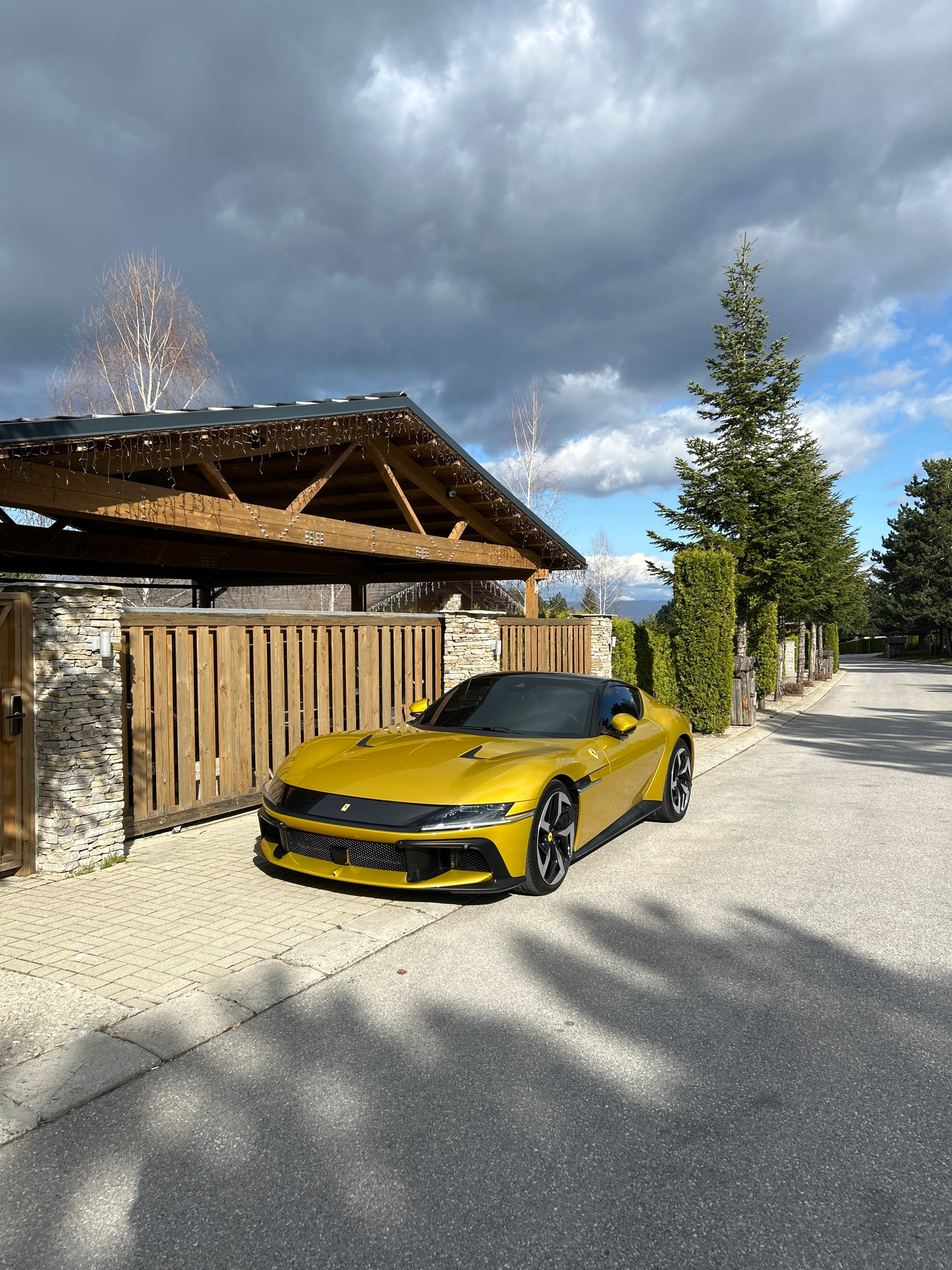 The image shows a yellow sports car parked on a road in front of a wooden building. The building has a stone base and a wooden roof structure with string lights attached. The sky is cloudy with patche…read more