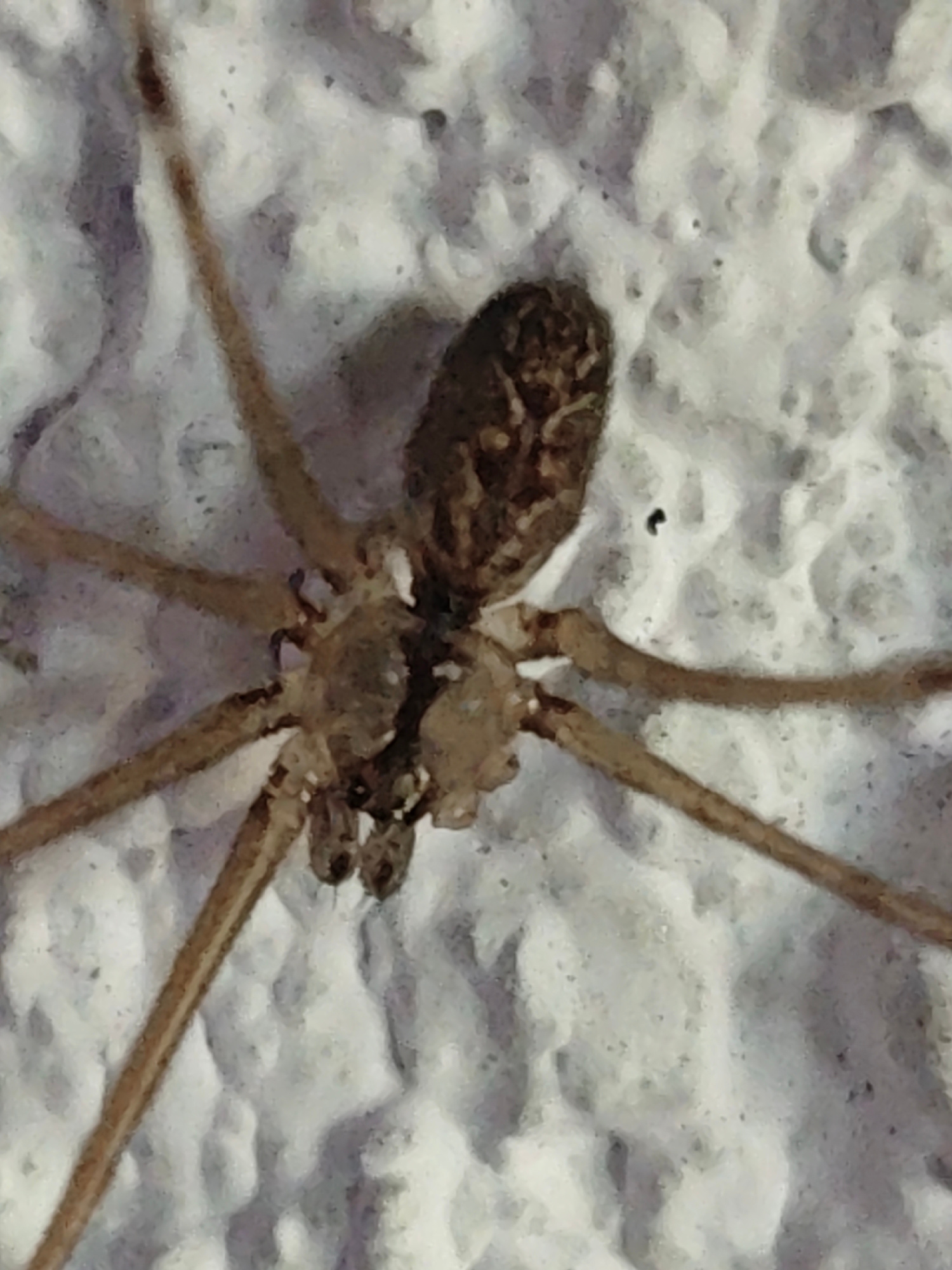 The image shows a close-up of a spider, likely a cellar spider (Pholcidae), on a textured, light-colored surface, possibly a wall. The spider has a small, elongated body with long, slender legs. The s…read more