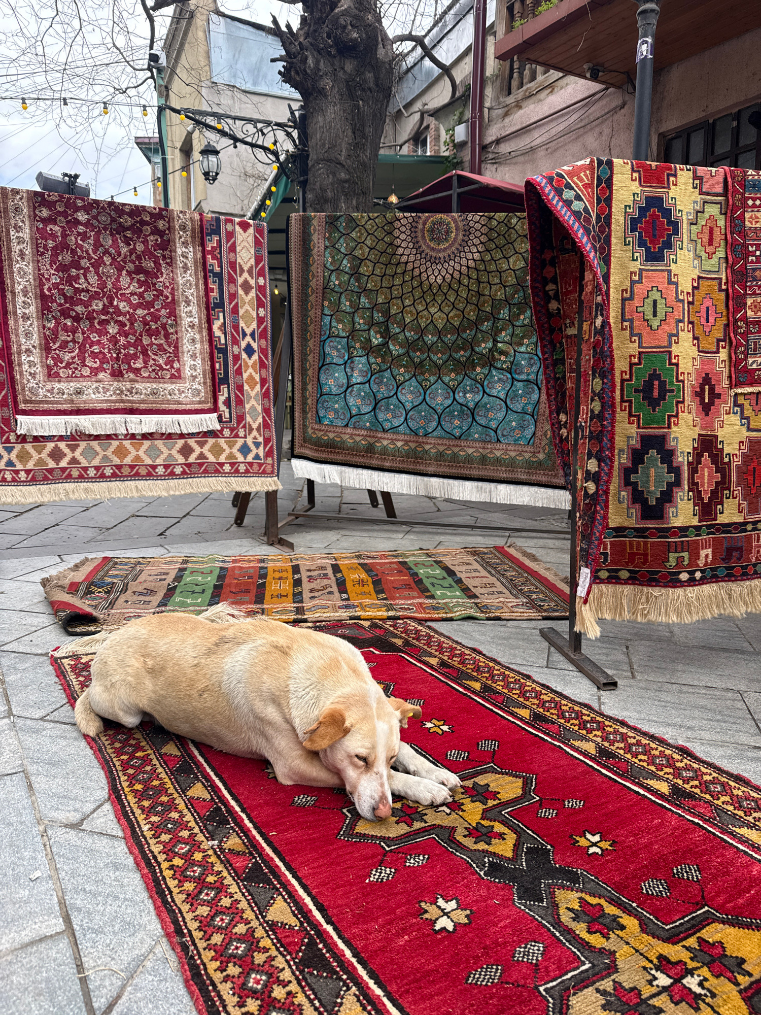 A dog sleeps on a red rug, positioned on the sidewalk in front of a rug shop in Tbilisi, Georgia. Several rugs hang on a metal rack. Above the rugs and partially obscured by bare tree branches is a bu…read more