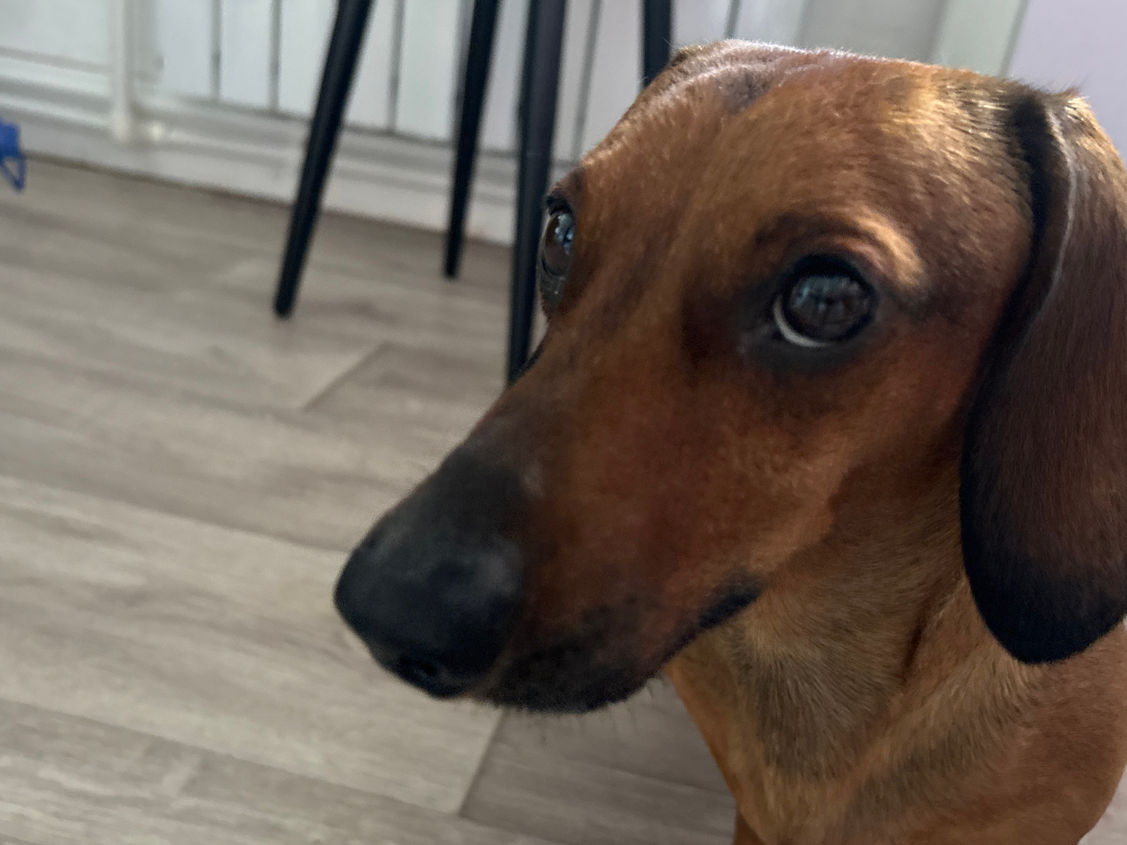 A close-up shot of a brown dachshund. The dog's head is in profile, facing left, with its black nose prominently displayed in the foreground. Its brown fur is visible, along with one floppy ear. The b…read more