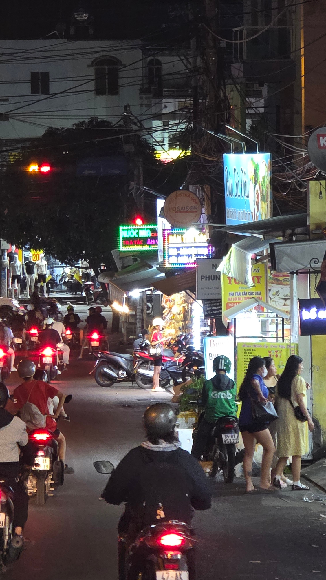 This is a vibrant, nighttime street scene in Bắc Nha Trang, Vietnam, bustling with activity. The image depicts a dense urban environment with numerous motorbikes, pedestrians, and brightly lit commerc…read more