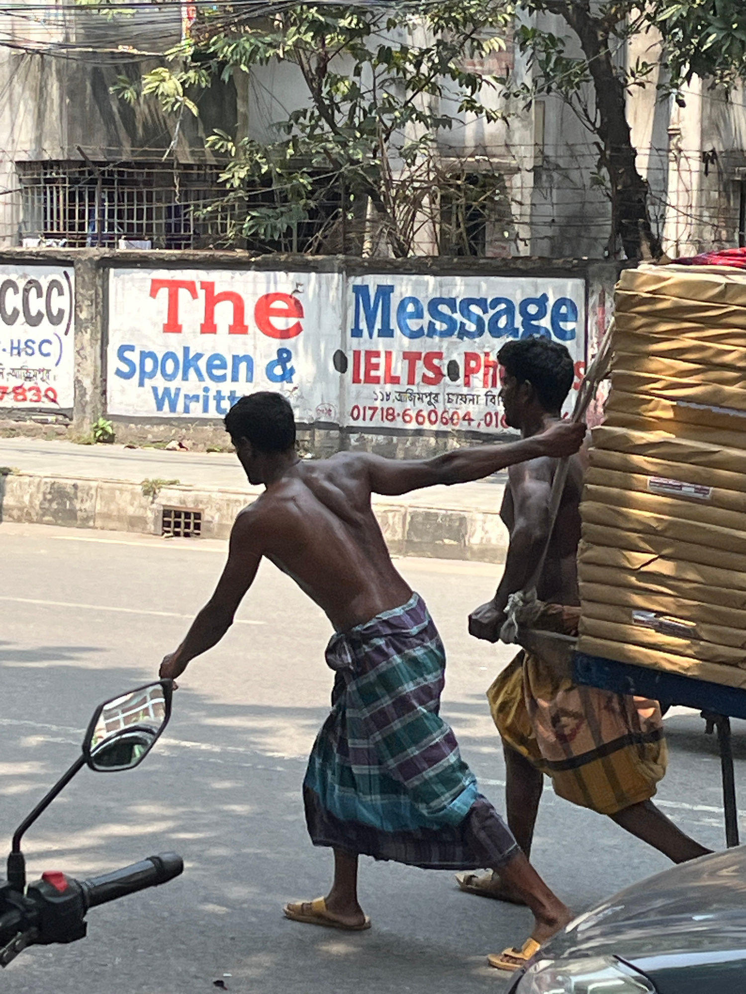 The image depicts two shirtless men in Dhaka, Bangladesh, transporting a large, wrapped bundle on a wheeled cart along a street. The men are wearing lungis, a traditional garment. One man is wearing a…read more