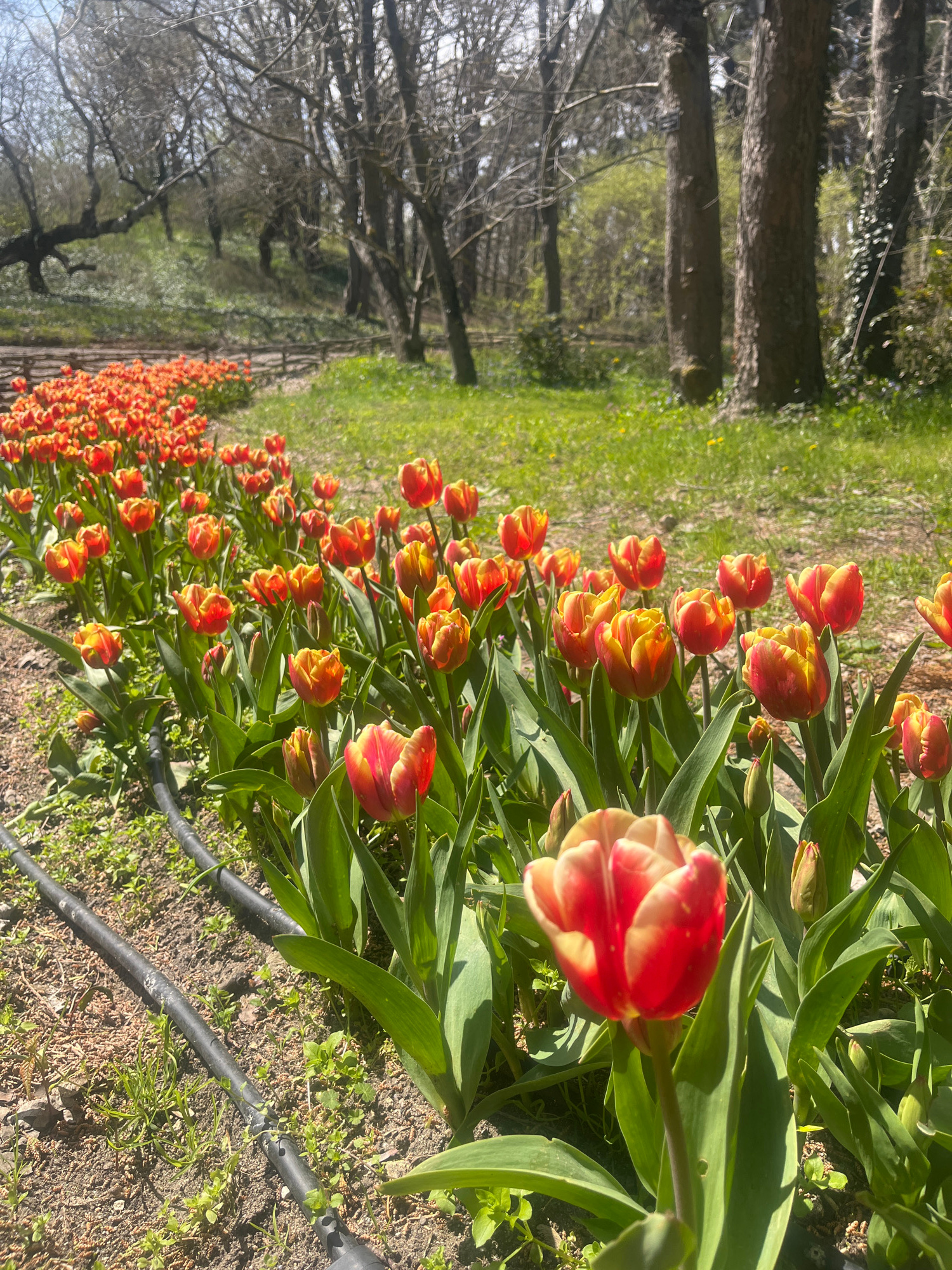 A row of red and yellow tulips lines a path in a park or garden. The image's orientation is sideways. To the left of the flowers is a path and trees, some bare and some with green leaves. The ground i…read more