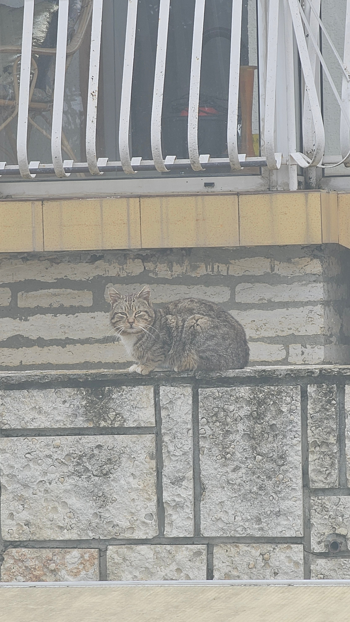 A tabby cat lies curled on a gray stone ledge outside a building in Rogachevo, Bulgaria. The ledge is composed of textured, light-colored stones arranged in a rectangular pattern with gray grout. To t…read more