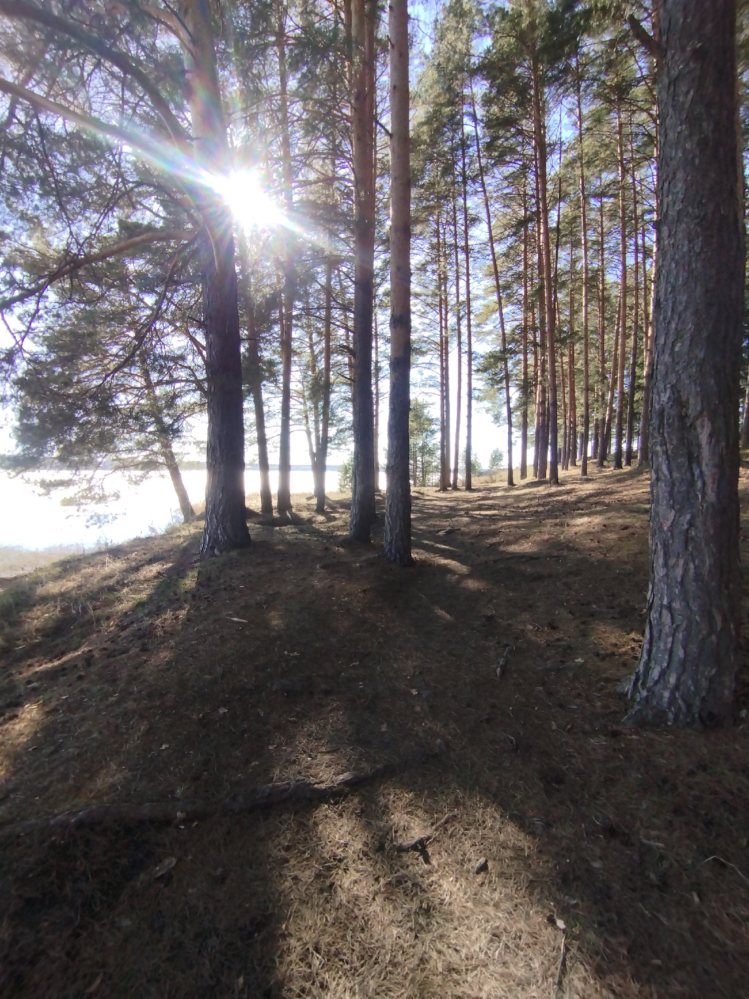 This photograph depicts a wooded area adjacent to a body of water, likely a lake or reservoir. The scene is dominated by numerous tall, slender pine trees, many of which display bark coloration variat…read more