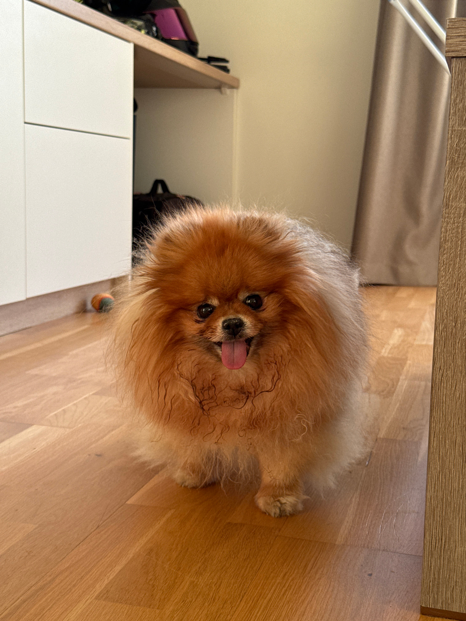 A fluffy, light brown Pomeranian dog with its tongue sticking out is positioned in front of a white cabinet with wooden trim, on a light-colored wooden floor. The dog is indoors. The scene lacks speci…read more