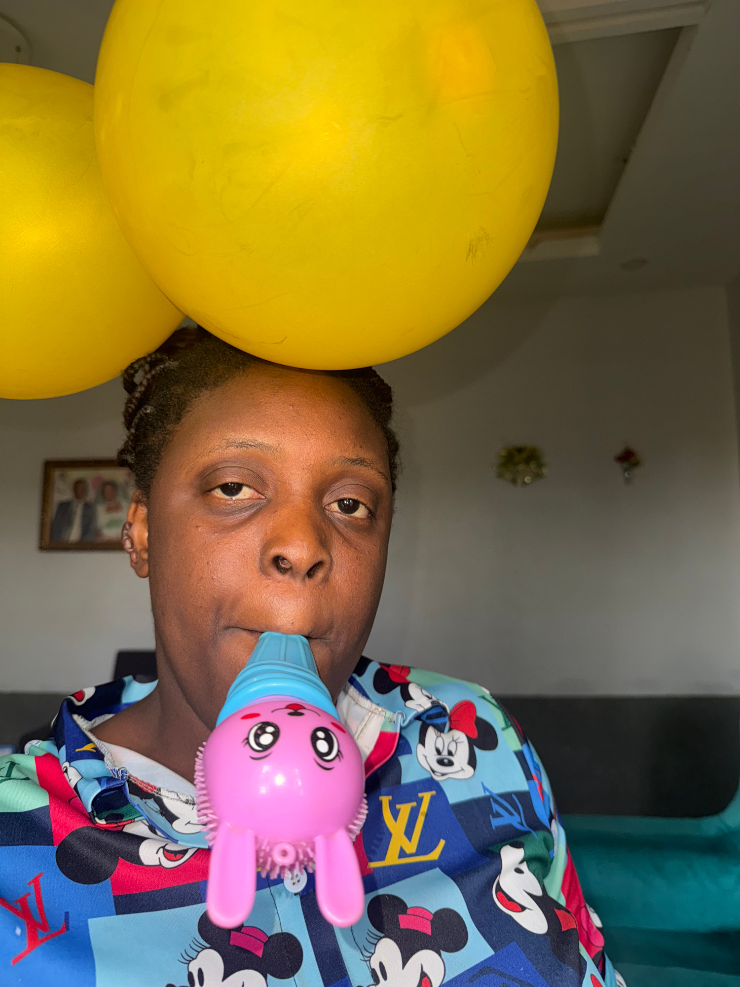 A dark-skinned person is holding a pink toy bunny-shaped bottle to their mouth. Two yellow balloons are to their left. The person is wearing a light blue shirt with cartoon characters. An interior bac…read more