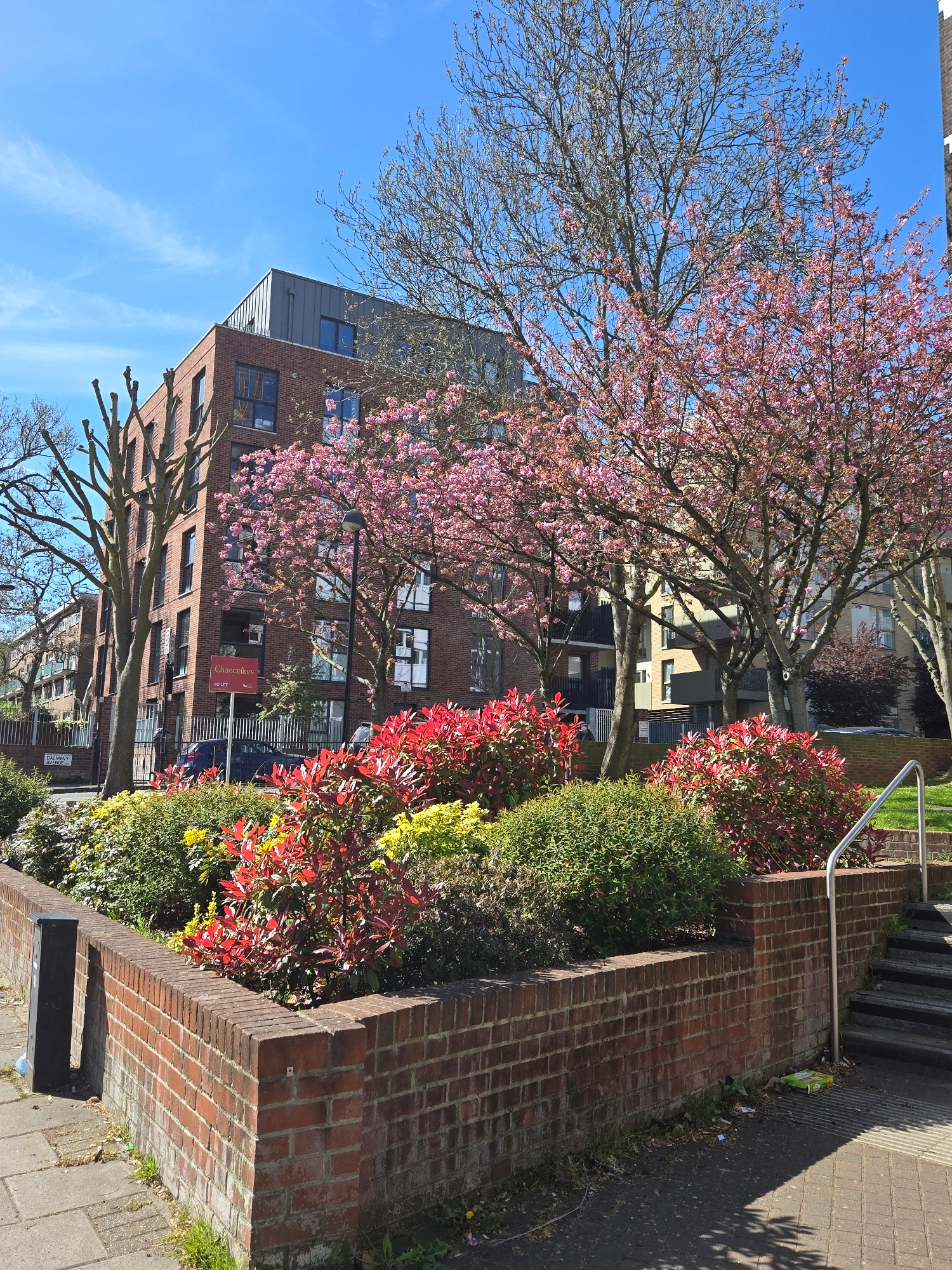 The image captures a street scene in London, United Kingdom. A tree with pink blossoms is prominently featured, partially obscuring a multi-story brick building. The building has windows and possibly…read more