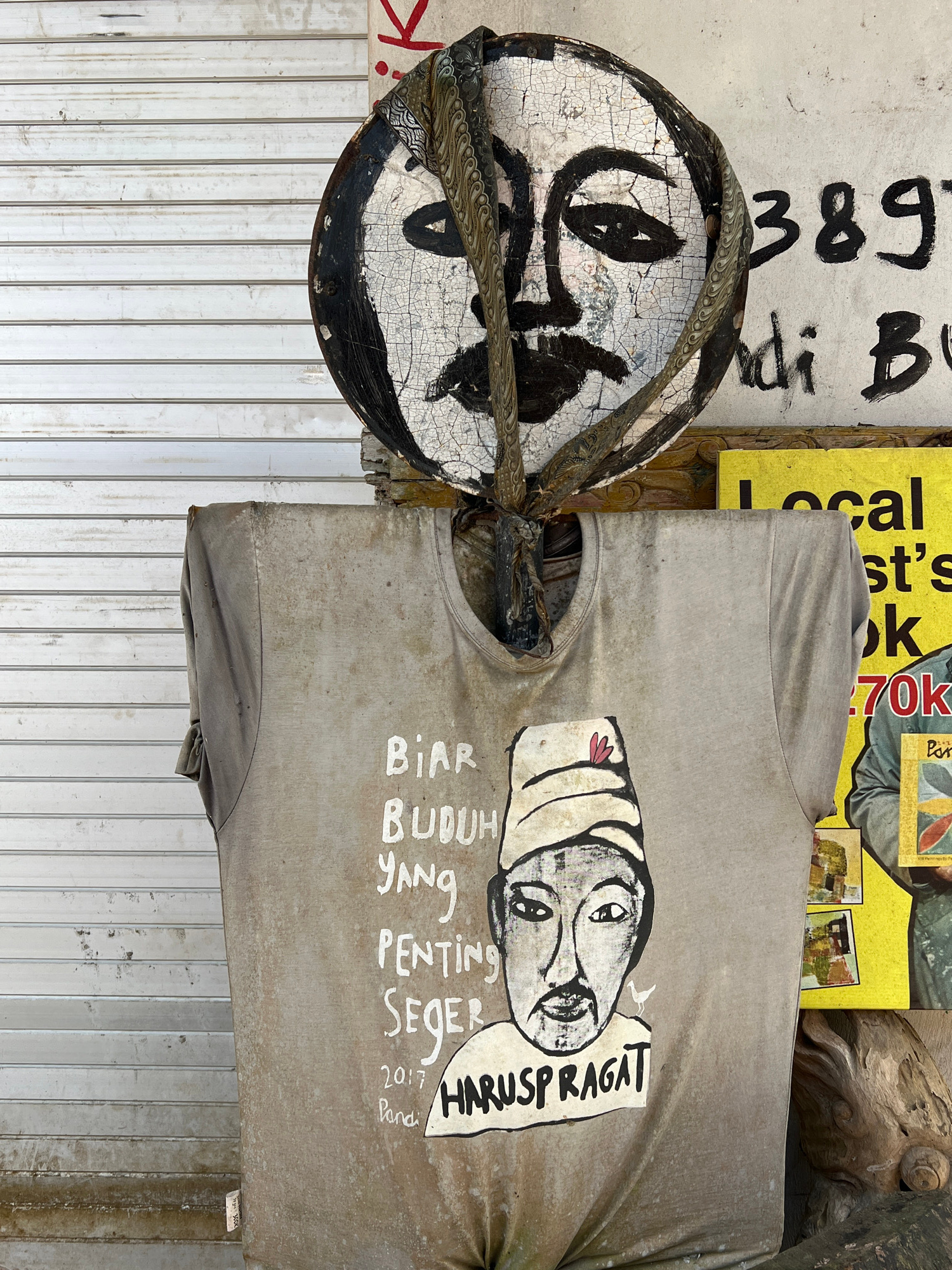 The image shows a cluttered outdoor scene in Ubud, Indonesia. A weathered gray t-shirt with a hand-drawn portrait and the words "BIAR BUDUH YANG PENTING SEGER HARUSPRAGAT" (translated "Let it be stupi…read more