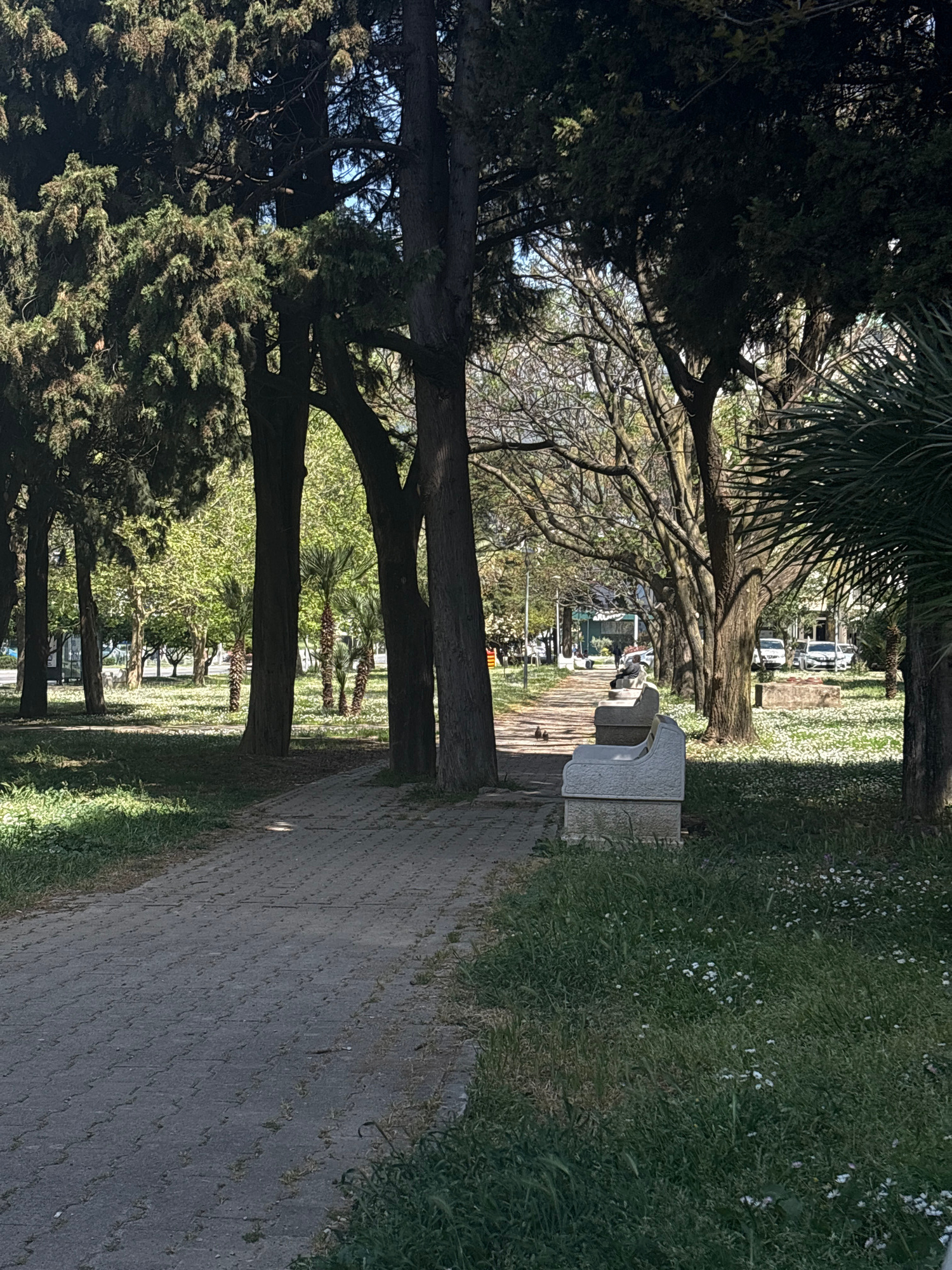 The image captures a serene outdoor scene, likely a park or promenade, under bright daylight. A paved walkway, constructed from grey interlocking pavers, stretches from the foreground towards the back…read more
