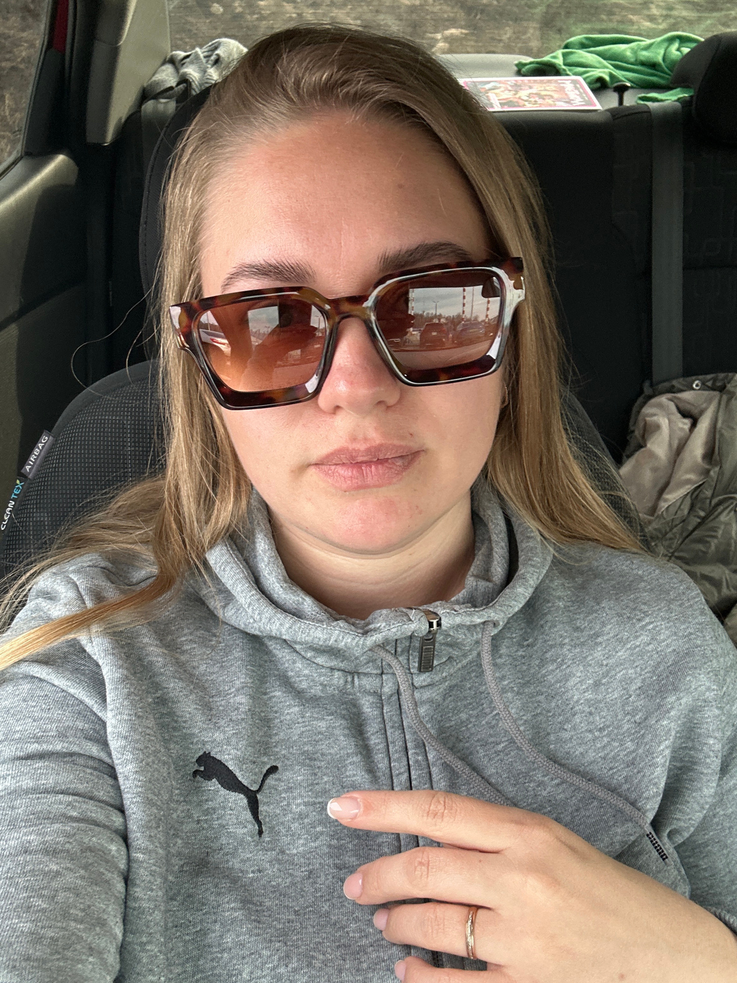 A young woman with blonde hair is wearing sunglasses and a gray Puma hoodie. She is wearing a ring on her finger. The background shows hints of green foliage and an object with text in a foreign langu…read more
