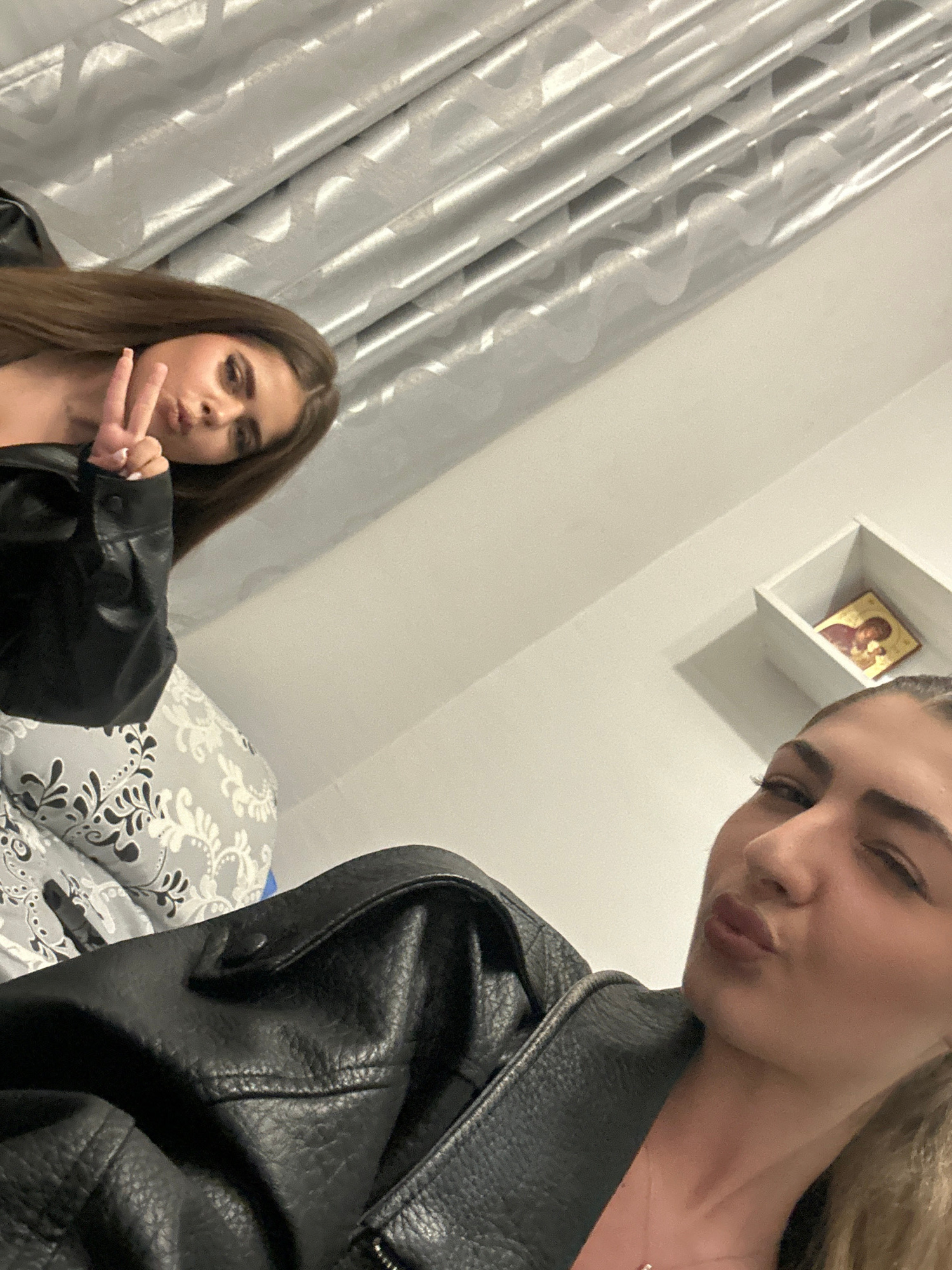 Two young women are posing for a selfie indoors. One woman is close to the camera on the right, wearing a black leather jacket and making a kissing face. The other woman is further back on the left, a…read more