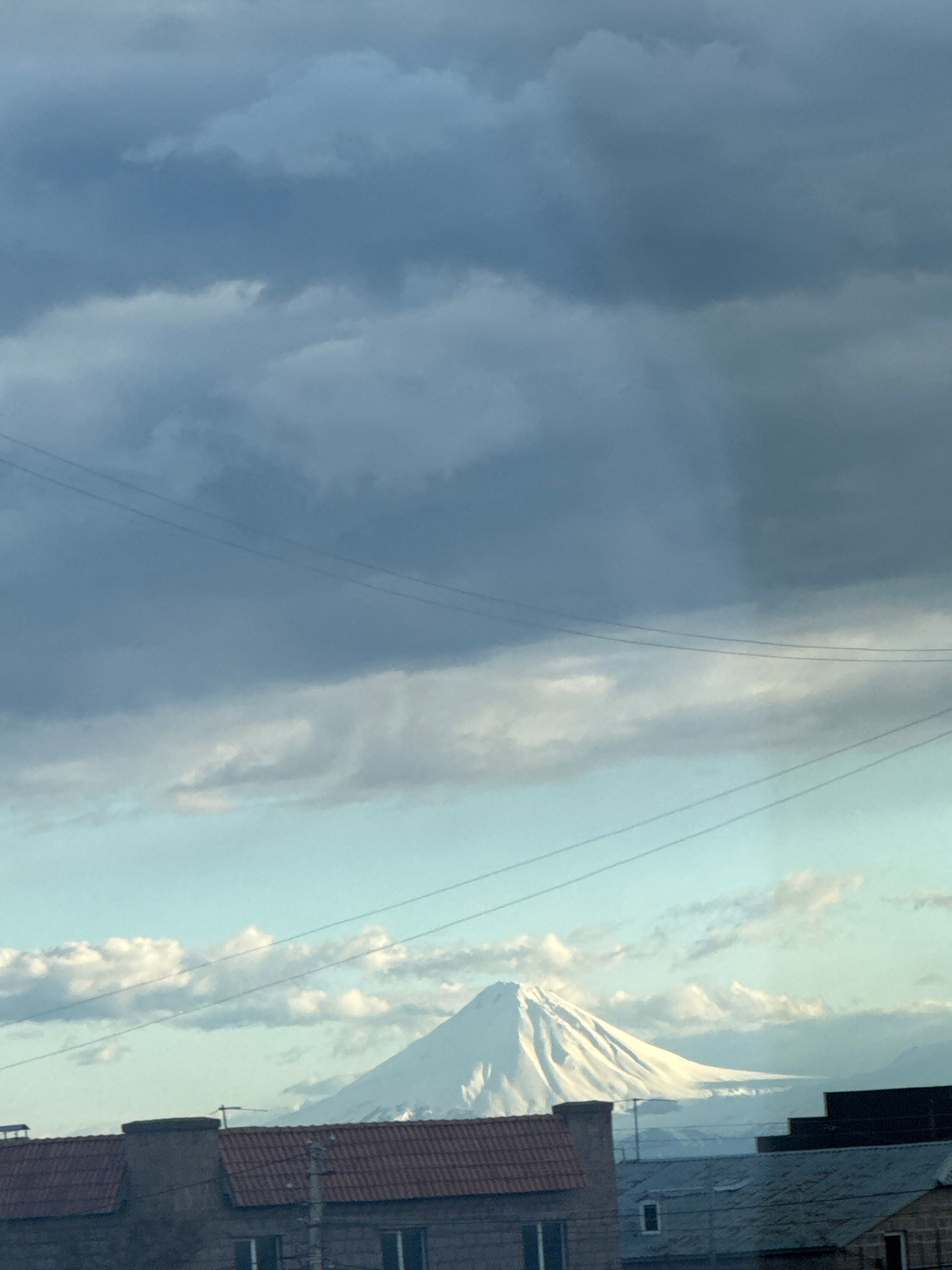 An eye-level, vertical shot, taken in Verin Ptghni, Armenia, shows a cloudy sky to the left with power lines running across it, while a mountain can be seen on the right. Building structures are visib…read more