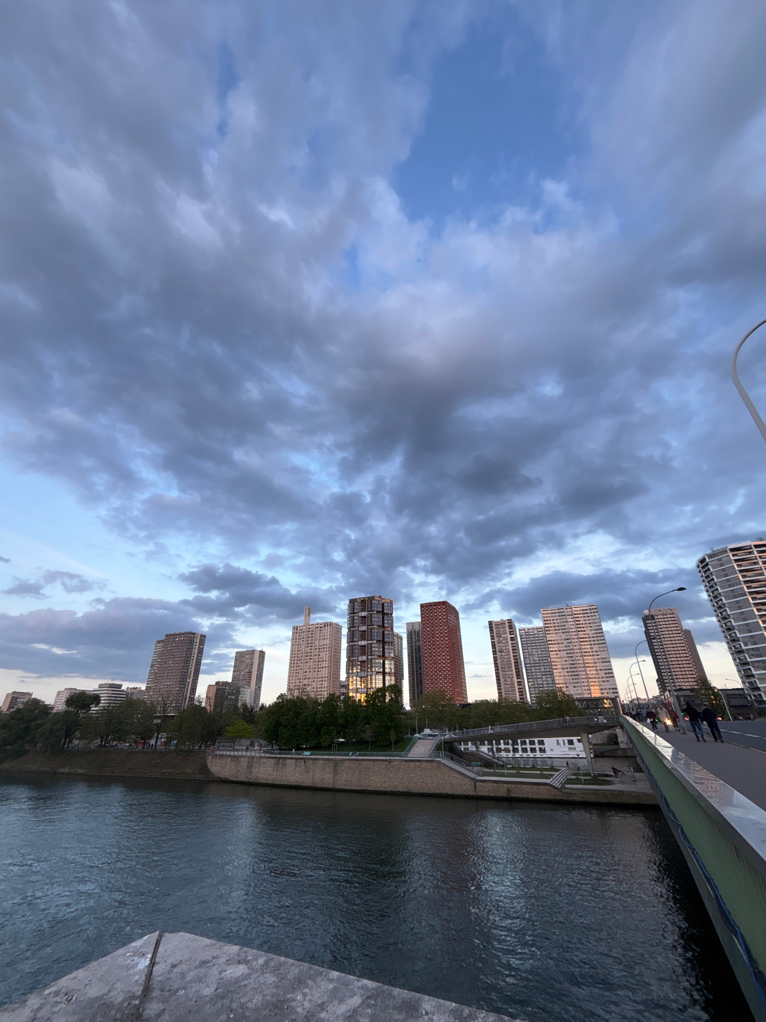 The image captures an urban waterscape in Paris, France, from an elevated perspective, likely a bridge or high embankment, under a dramatic, cloudy sky. The lighting suggests either late afternoon orβ¦read more