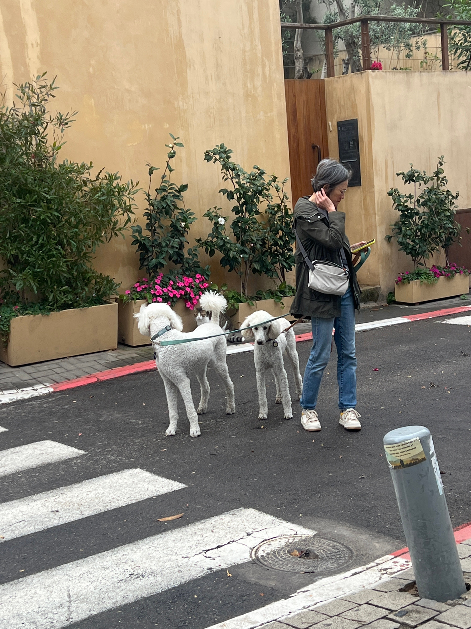 A woman with short gray hair walks two white standard poodles along a street in Tel Aviv, Israel. She is wearing a green jacket, blue jeans, and white sneakers, and she is holding a smartphone. A gray…read more