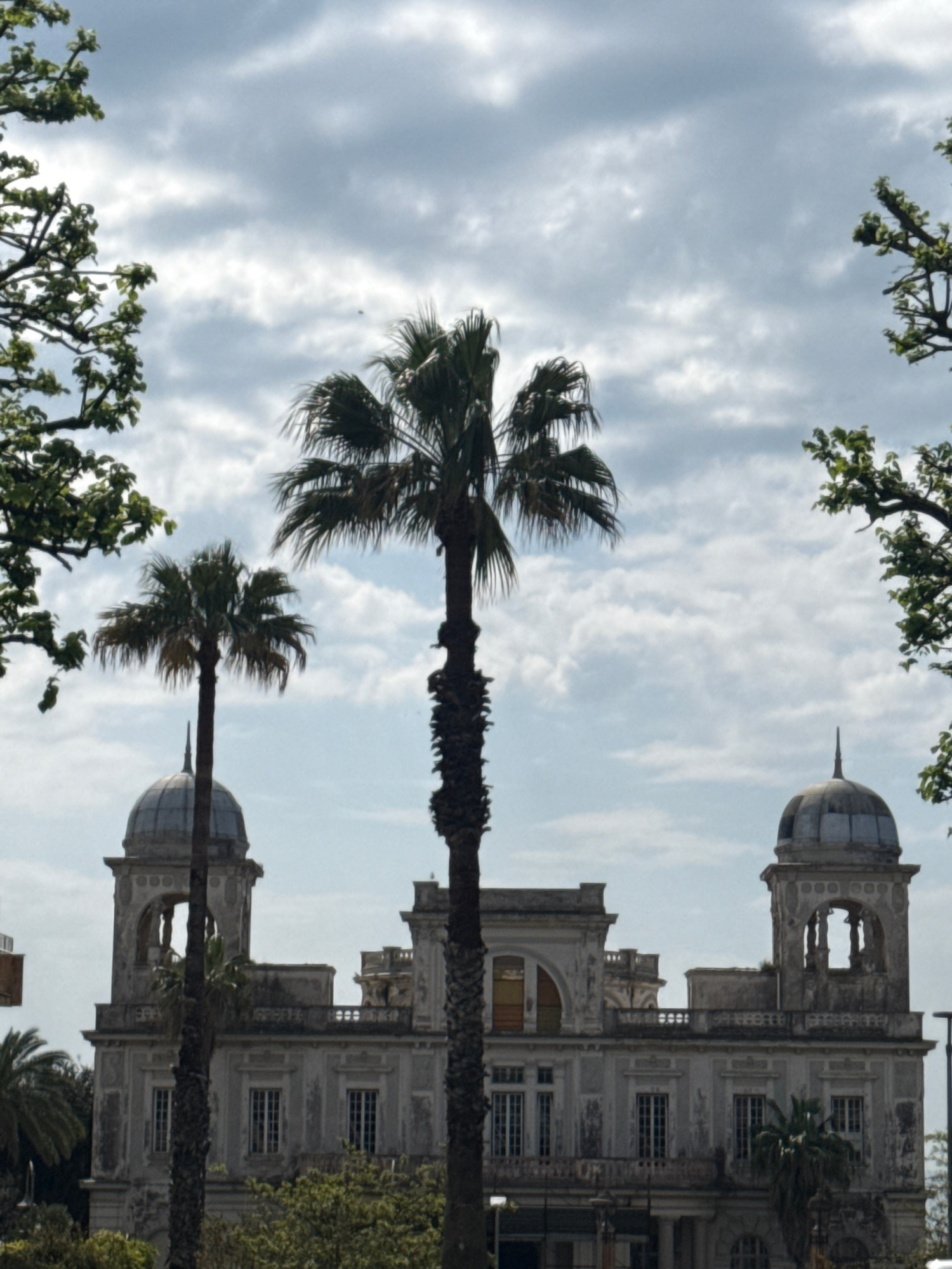 The image shows a weathered, multi-story building with domed towers in Anzio, Italy. Palm trees are visible in the foreground, partially obscuring the building. Trees with green leaves frame the botto…read more
