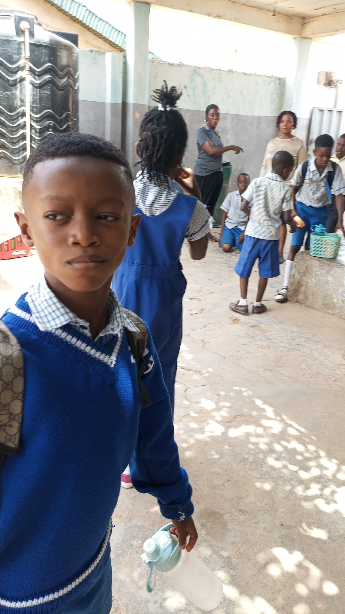 **People:** Several children, likely students, are present. One boy in the foreground wears a blue sweater over a checkered shirt, carrying a water bottle. Other children are in school uniforms. Two a…read more