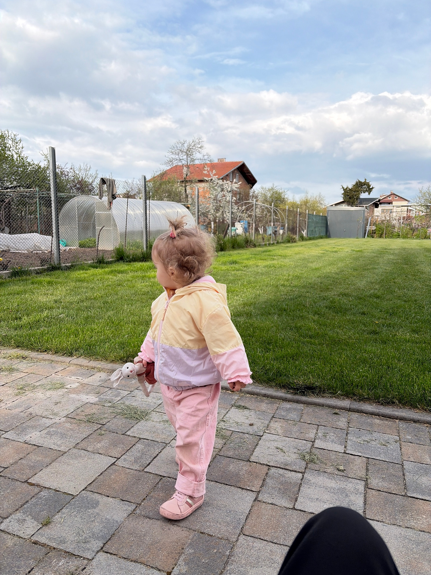 A young child, seen from the back, stands on a paved pathway in what appears to be a backyard or garden in Sofia, Bulgaria. The child has light brown or blonde hair tied in a small ponytail with a pinβ¦read more