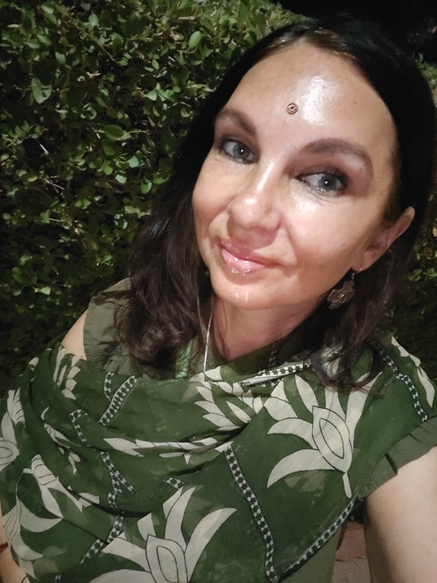 A woman with dark hair and light eyes is seen in an outdoor setting, likely in Puttaparthi, India, as indicated by the traditional bindi on her forehead and her attire. She is wearing a green scarf or…read more