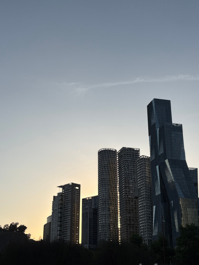 A collection of modern skyscrapers reaches towards the sky, set against a backdrop of pale blue and muted yellow. The buildings showcase varying architectural styles, some with unique, staggered desig…read more