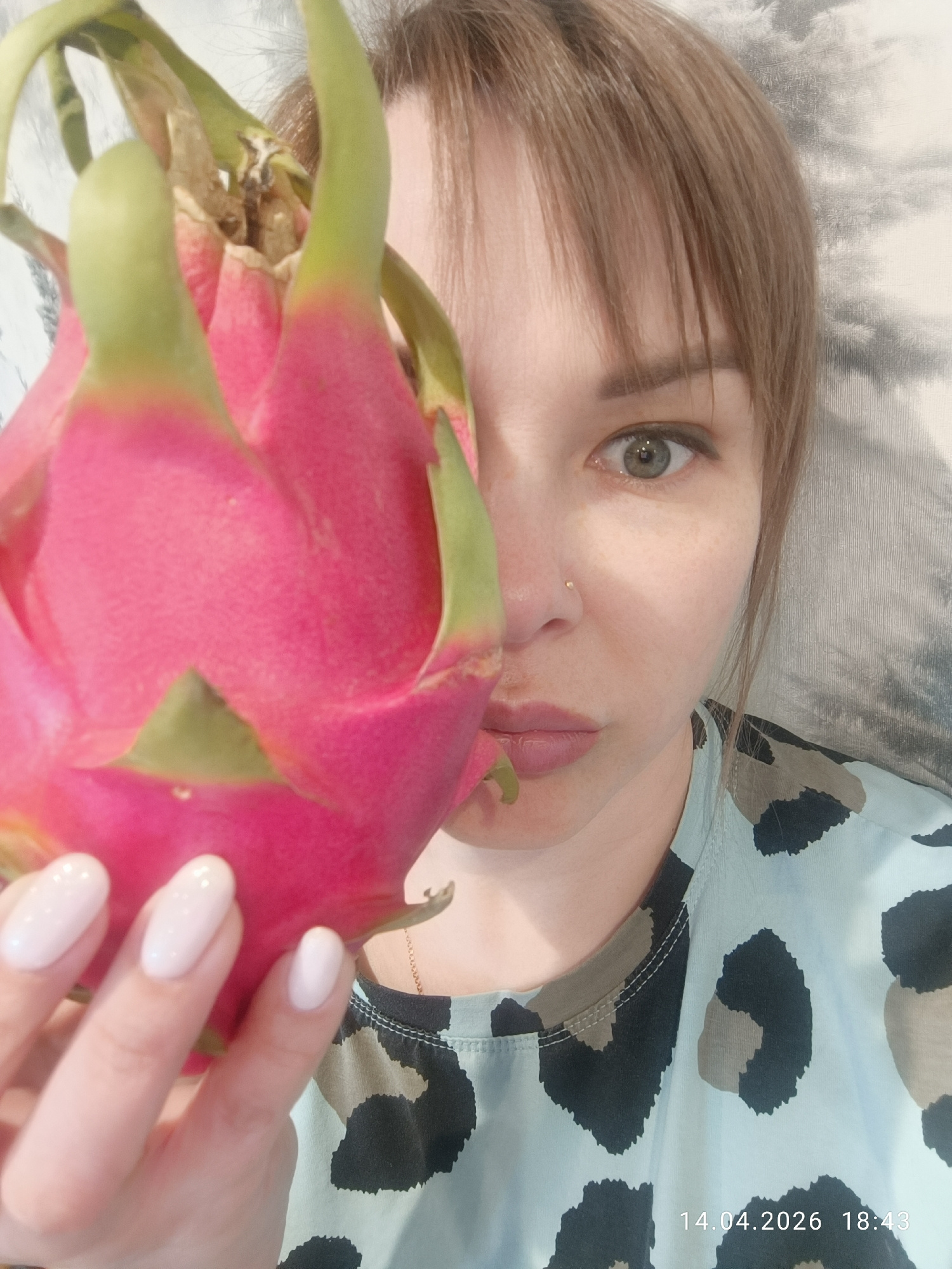 A woman is holding a dragon fruit in front of her face. She is wearing a light blue shirt with a black and brown animal print. Her fingernails are painted pale pink. She has light brown hair and greyβ¦read more