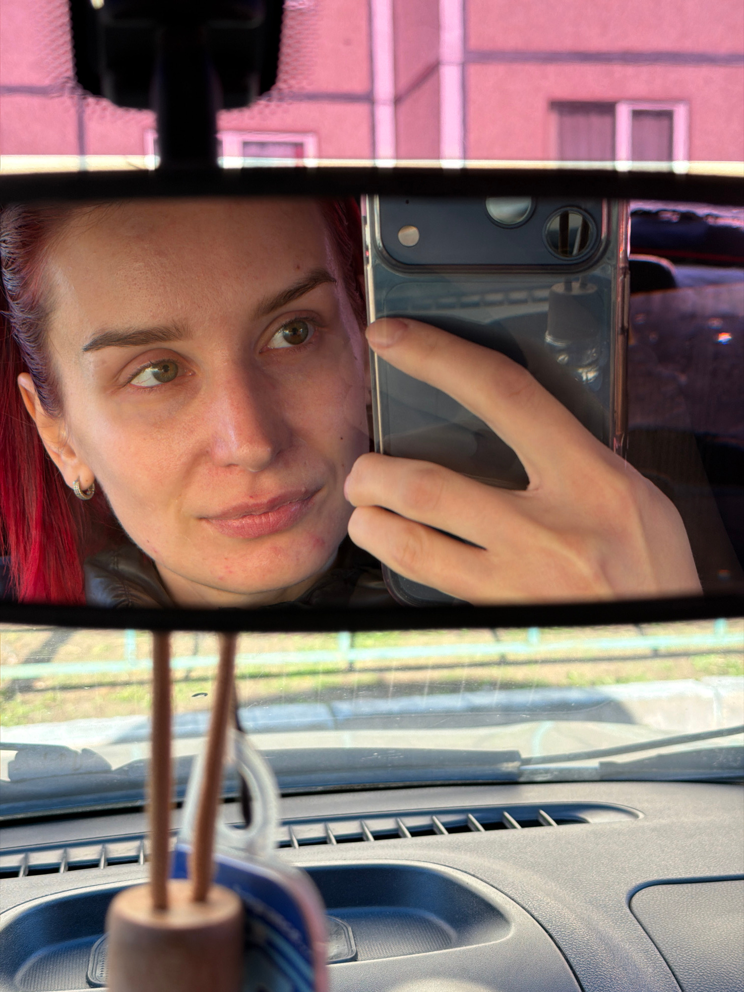 A selfie is captured through a car's rearview mirror, featuring a person with reddish hair and green/hazel eyes. The subject's face is reflected sideways in the mirror, displaying a neutral expression…read more